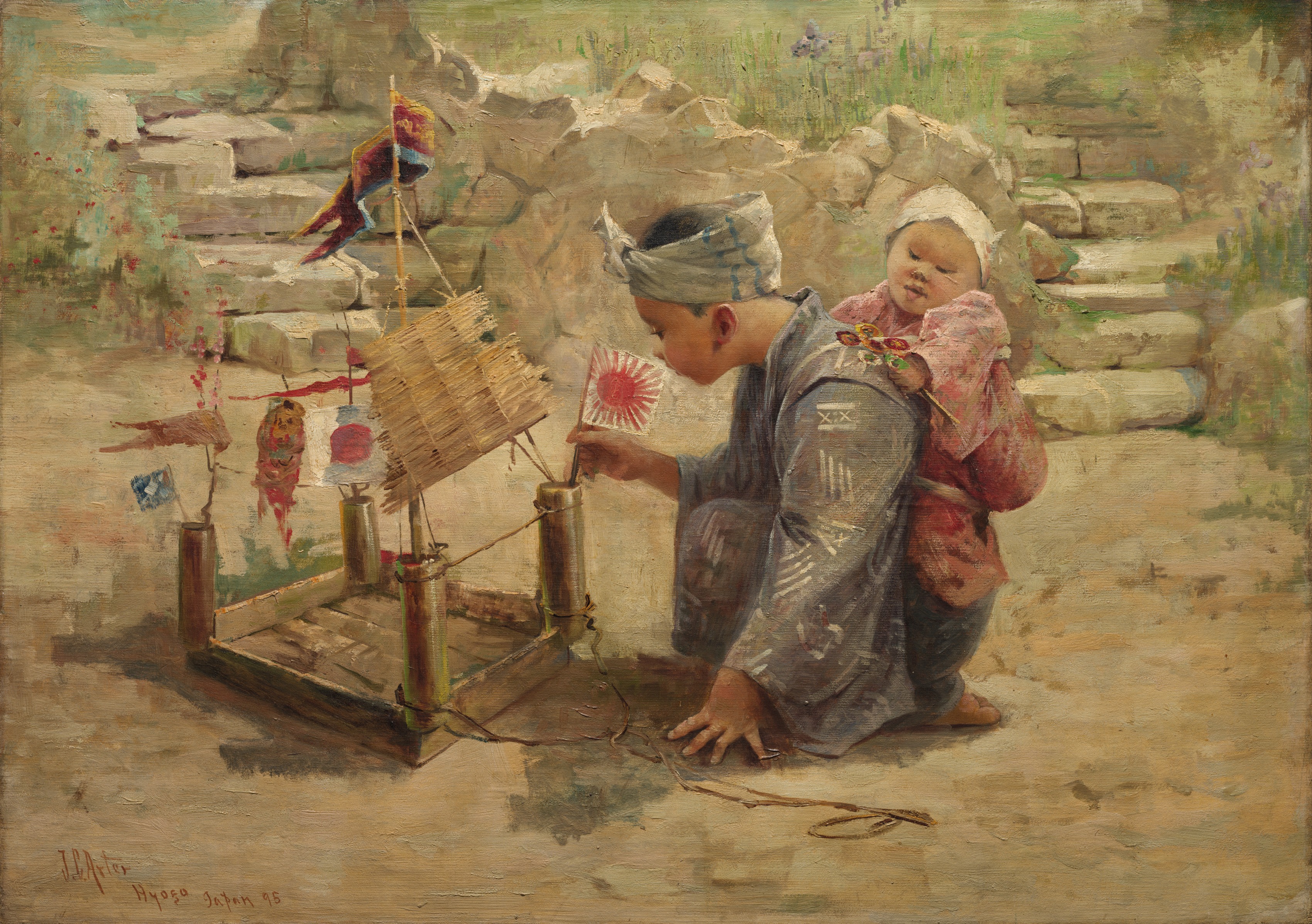 A young boy, wearing a gray robe and headband, crouches on the ground while holding a Japanese toy. He has a baby on his back, dressed in pink with a white head covering. The boy is focused on a man-of-war kite, which is propped up on a wooden stand. The kite has a long tail and several small decorations. In the background, there are stone steps leading up to a grassy area with rocks and purple flowers. The scene appears to be set in a rural or natural setting.