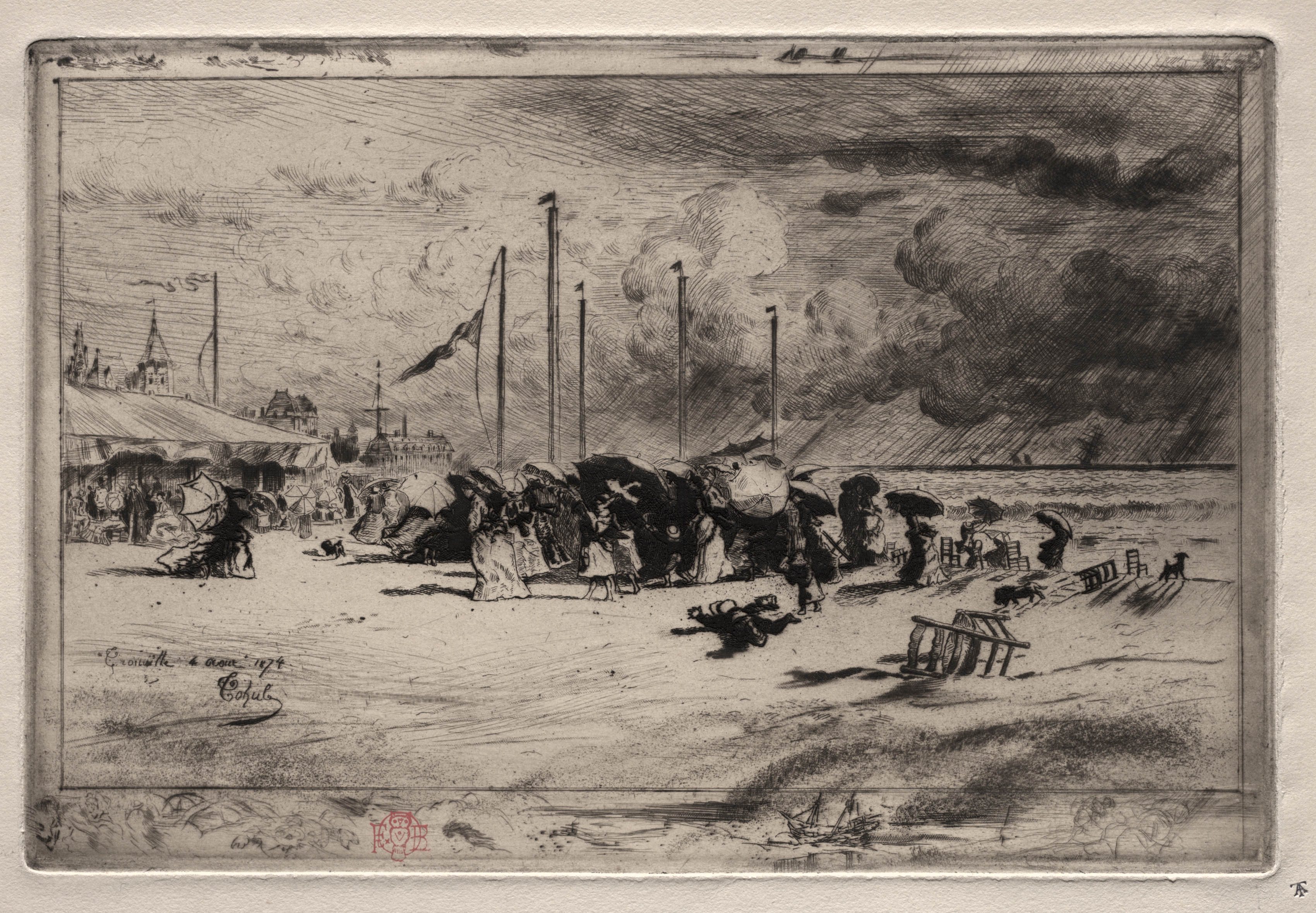 The image depicts a beach scene with people walking under umbrellas. The beach has a row of benches on the right side. There are several people on the beach, some holding umbrellas. In the background, there are buildings and a pier with flags. The sky is cloudy and dark, suggesting a stormy or windy day. The image is in black and white. The artist's monogram is in red in the lower-left corner. The title of the piece is "A Squall at Trouville" by Félix Hilaire Buhot.