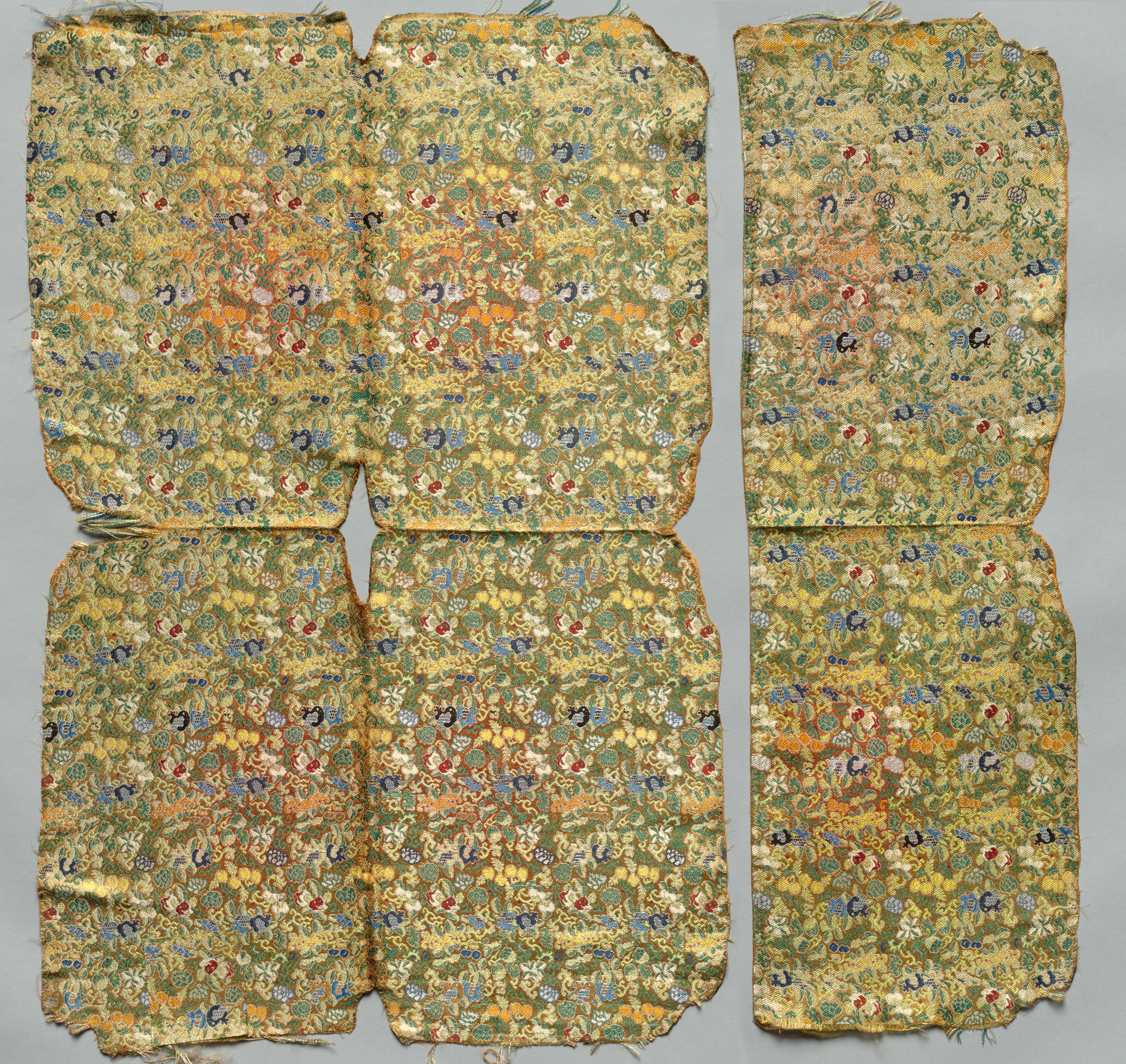 Yellow fabric with floral patterns in blue, green, orange, red, and white. The fabric is in six pieces, arranged in two columns of three. Each piece has a scalloped edge and appears to be made of silk or a similar material. The fabric is likely from the artwork "Fragments" by an unknown artist.