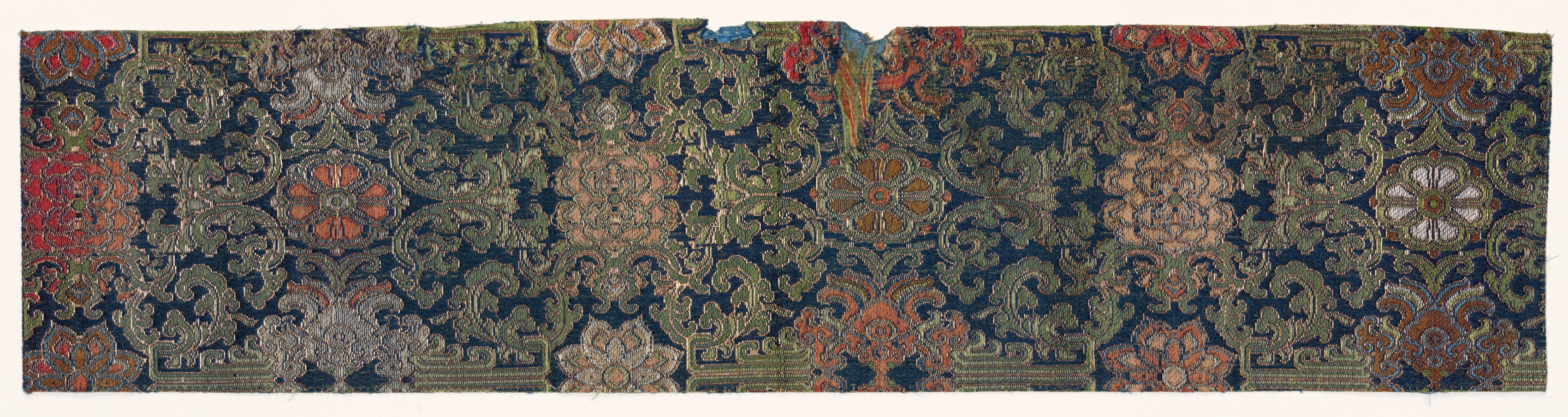 Rectangular textile with a dark blue background and intricate gold, red, orange, and white designs. The design features repeating patterns of floral motifs and scrollwork. The textile appears to be damaged, with a tear in the center and frayed edges. Gold accents are prominent throughout. Title: Textile Fragment. Artist: Unknown.