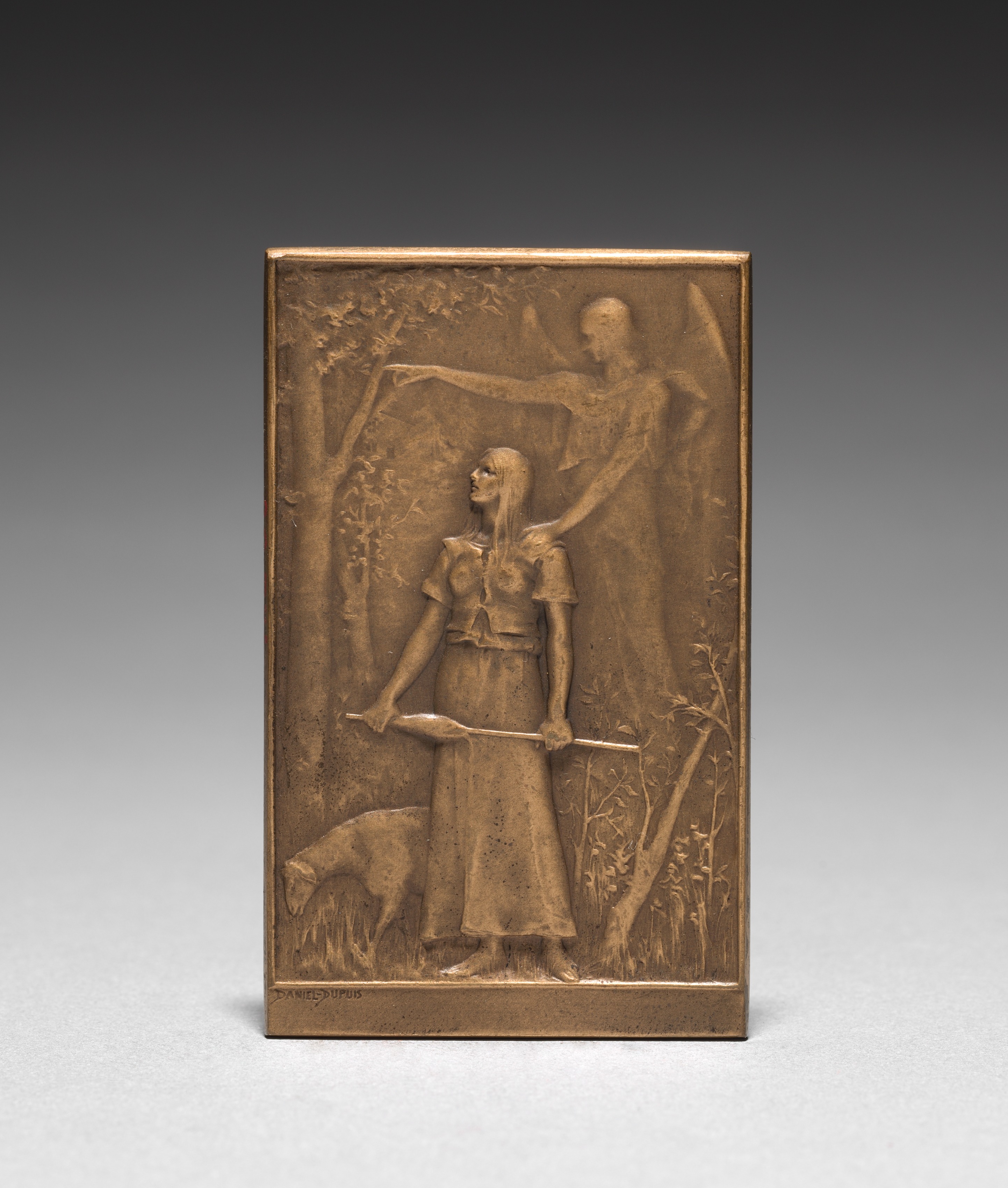 Rectangular bronze plaque with a raised relief design. The plaque depicts a woman with long hair wearing a dress and holding a sword. An angel with wings and a halo stands behind her, placing a hand on her shoulder. The woman looks up to the right. A dog is to her left. The background of the plaque features trees, leaves, and foliage. The plaque has a bronze color with a darker patina. The artist's signature is at the bottom left. The plaque stands on a white surface with a gray and black gradient background.