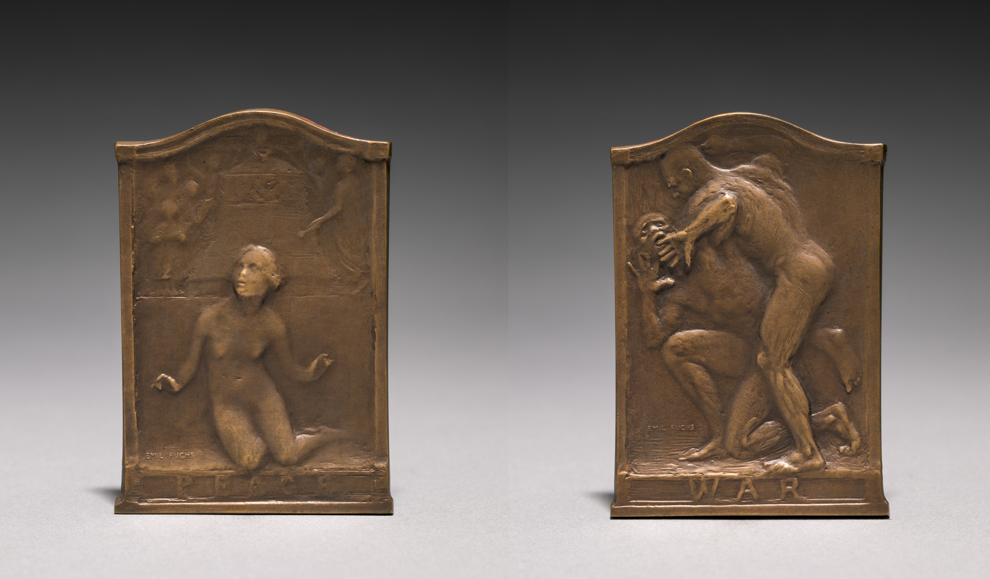 Two bronze-colored, rectangular plaques with a wavy top edge. The left plaque features a kneeling nude male figure with arms outstretched and hair pulled back, in the background a wall with a figure on top and foliage on the left. The right plaque depicts two nude male figures, one on top of the other, the top figure's arms wrapped around the other's head and neck. The word "WAR" is at the bottom.