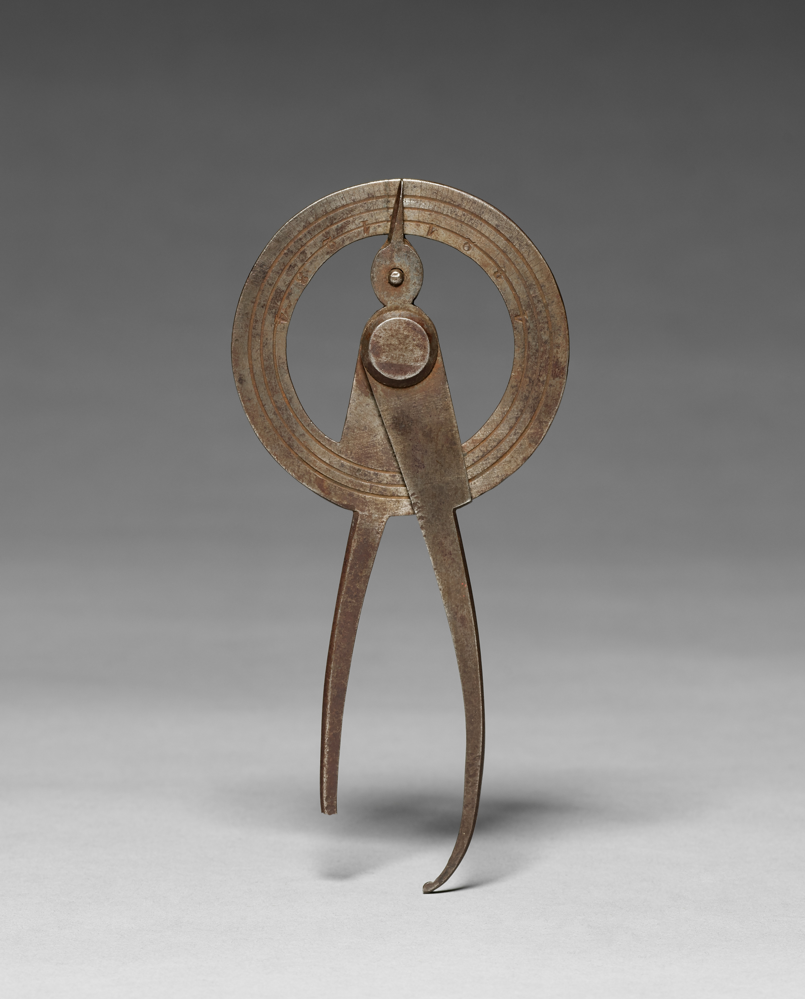 Metal tool with a circular body and two long, curved legs, resembling calipers; circular body features a central circle and lines; two metal pieces overlap in the center with a small circle and screw; legs are thin and tapered. Inside and Outside Calipers, artist not specified.