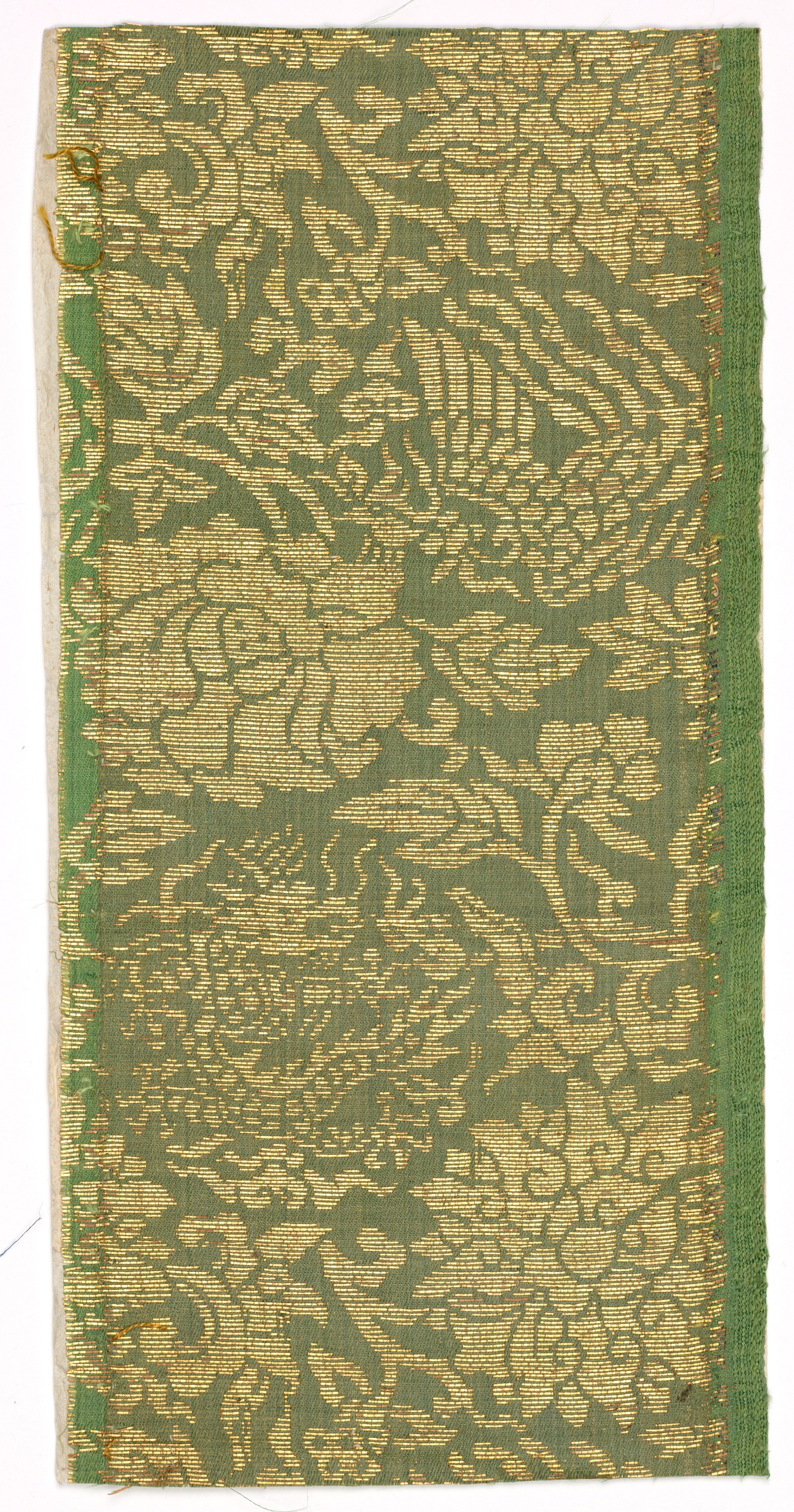 Green and gold textile fragment. The fragment is rectangular. The main body of the textile is green with a gold floral pattern. The pattern features flowers and leaves. There is a green border on the right and left edges. The left and right borders are approximately one centimeter wide. The left edge has loose yellow thread. The background behind the textile is white.
