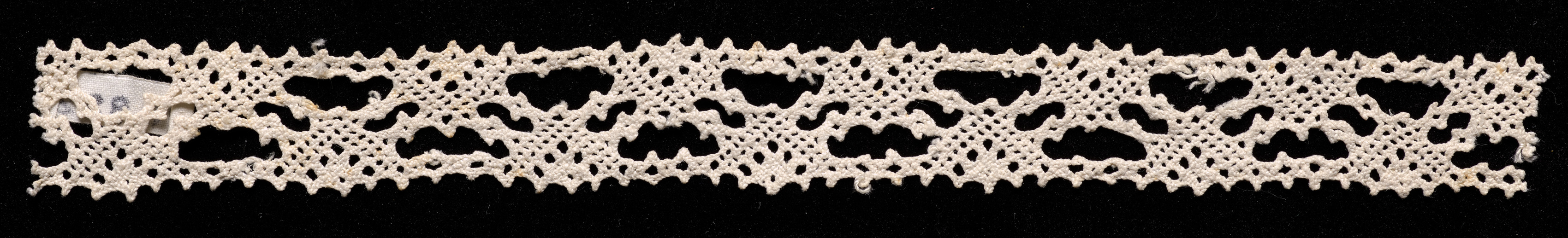 White bobbin lace with a repeating pattern of holes and small rounded scallops along top and bottom edges. The lace is long and narrow with a floral design. A tag is attached to the left side. Black background. Title: Bobbin Lace Insertion without Selvage. Artist unknown.