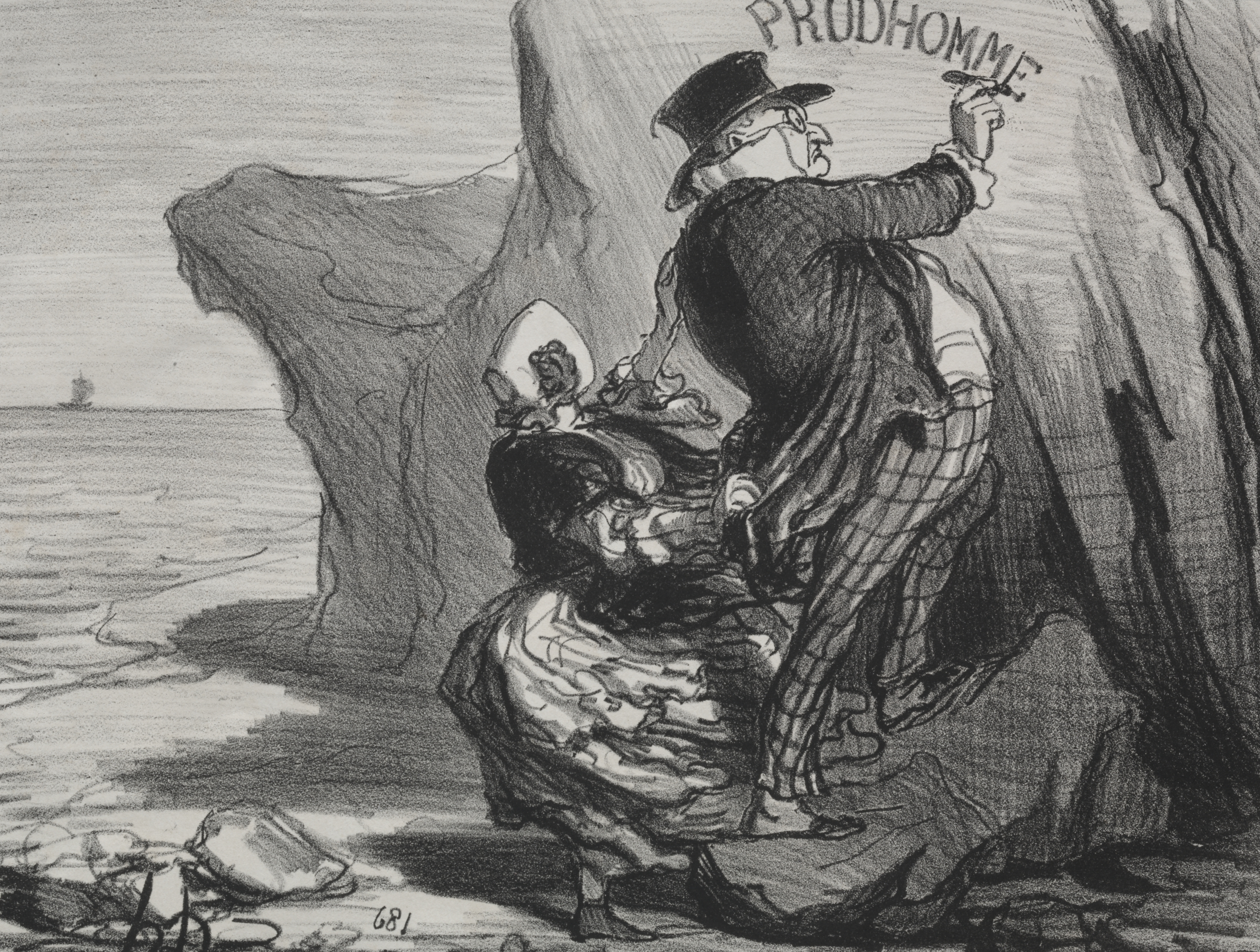 Black and white drawing of a man writing on a cliff. The man wears a hat, glasses, jacket and pants. He stands on one leg with the other bent in front of him. He holds a writing instrument in his right hand. The man is writing on the cliff with his right hand. A woman kneels in front of him. She wears a dress and a hat. The background shows a body of water with a ship on the horizon. A rock formation is to the right of the people. The drawing is titled "I want to leave an imperishable monument of our visit to this cliff". The artist is Honoré Daumier.