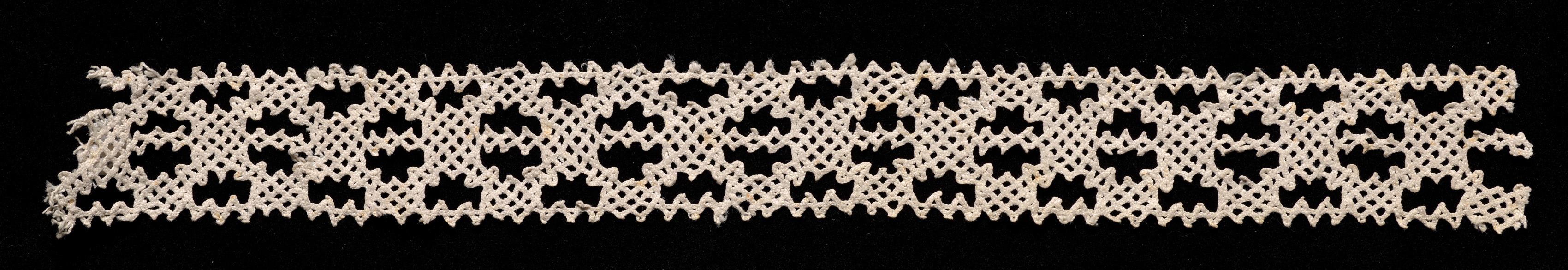 The image shows a piece of bobbin lace. The lace is long and thin, horizontally centered in the image. The lace has a zig-zag edge on top and bottom. The lace features a repeating pattern of holes arranged in rows. The holes in the center are star-shaped, while the holes toward the top and bottom are smaller and rounded. The lace is off-white. The background of the image is black. The artist and title of the piece are "Bobbin Lace Insertion without Selvage".