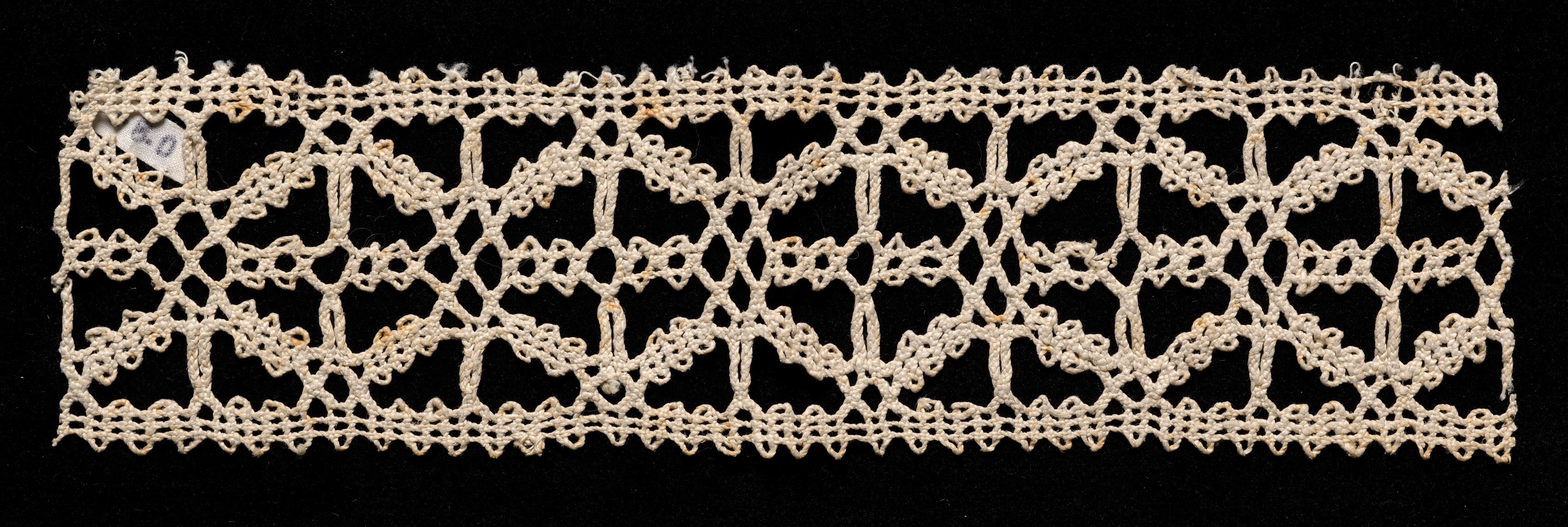 A long, thin, off-white piece of bobbin lace with a repeating pattern. The lace has a scalloped edge along the top and bottom. The lace is made up of rows of interconnected loops and twists. The background is black.