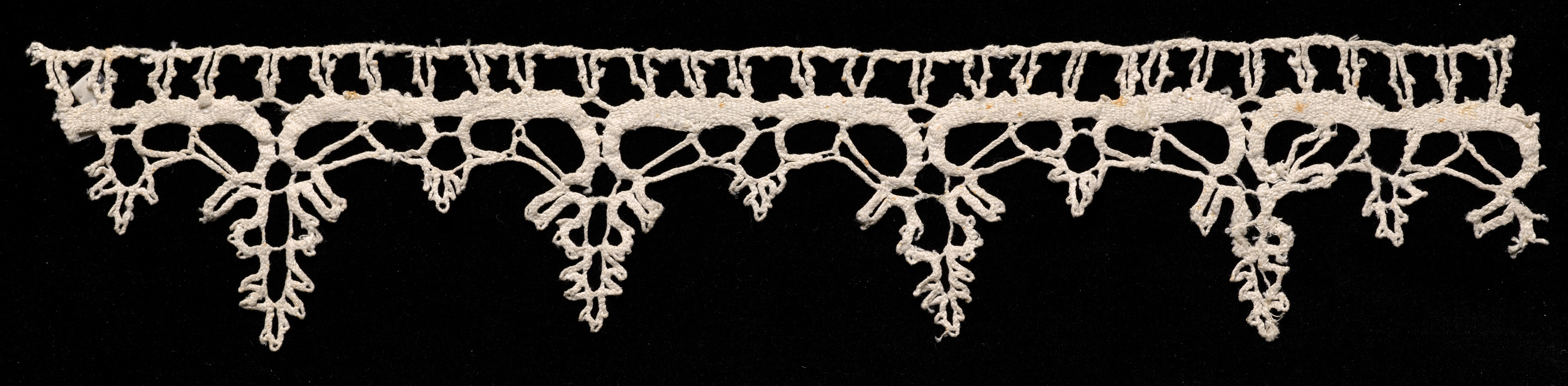 White bobbin lace edging with a repeating pattern of points; solid straight edge along the top; pointed drops hanging down from the bottom; against a black background; by an unknown artist titled "Bobbin Lace Edging of Points".