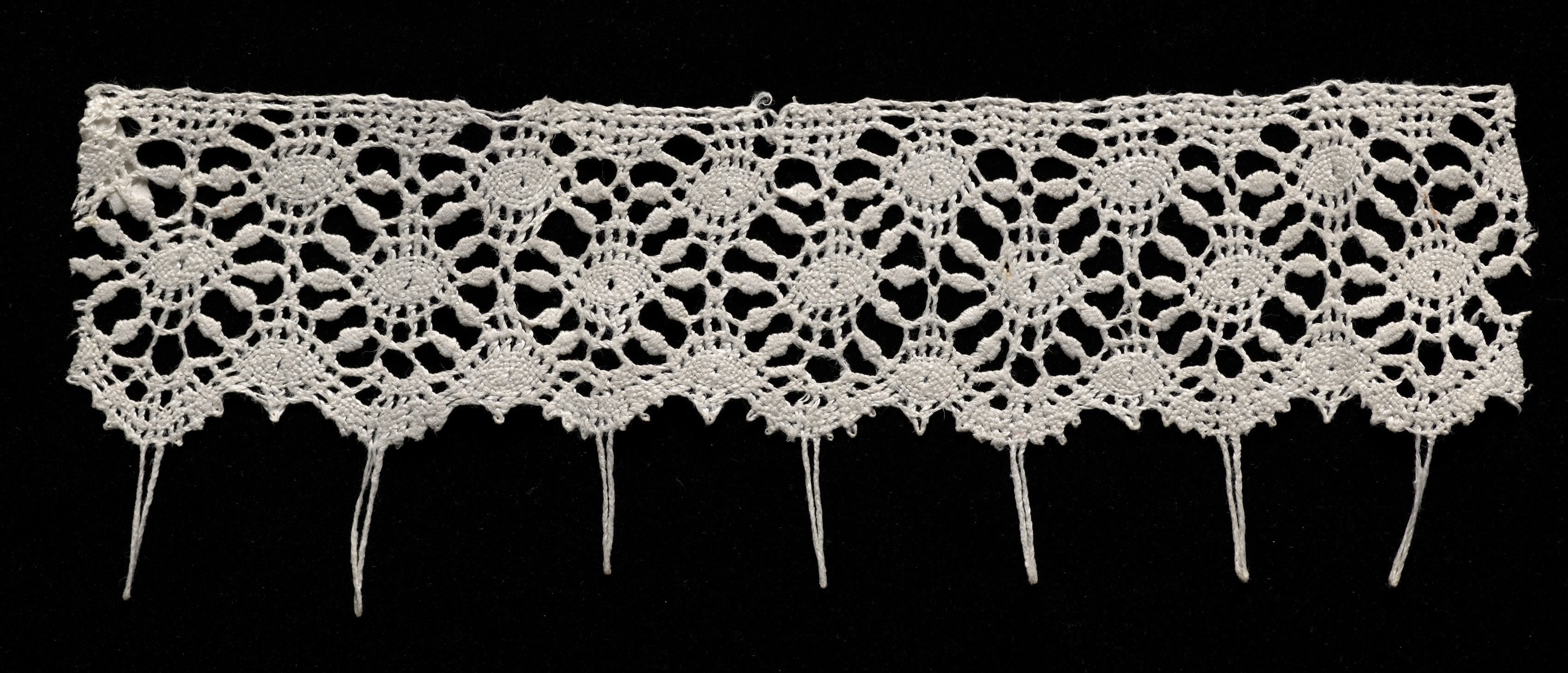 White crocheted lace edging with repeating floral patterns. The edging has a scalloped bottom edge. Six long, thin tails of yarn hang down from the bottom. The background is black. The lace is by an unknown artist and is titled "Bobbin Lace (Needlepoint Design) Edging with Loops".