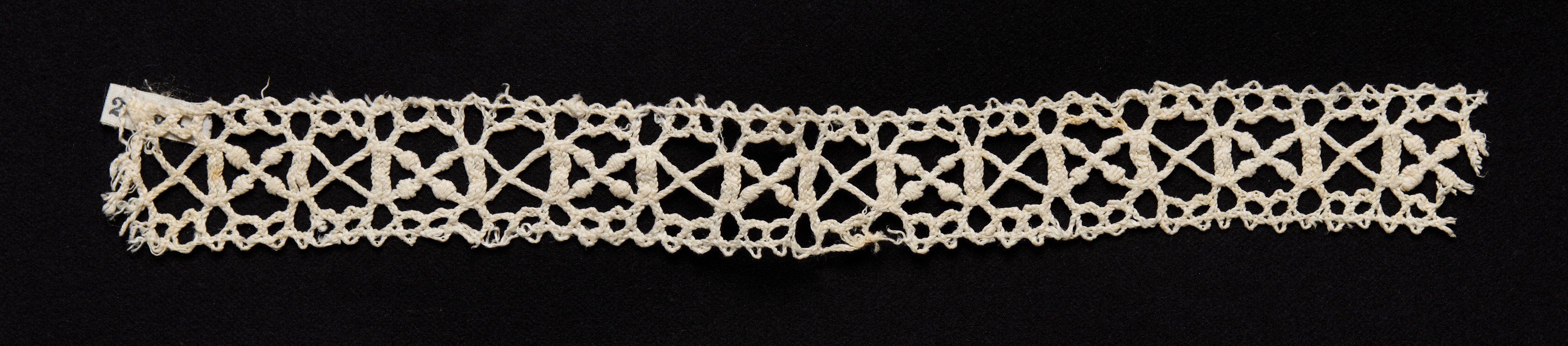 Long, narrow, off-white lace strip with intricate pattern. The lace has a repeating design of interconnected loops and stitches. The pattern consists of a series of diamonds with an X in the center, formed by crossing stitches. The edges of the lace are rough and uneven, with loose threads visible. A small piece of paper with writing on it is attached to the top left corner of the lace. The background is solid black. The work is titled "Bobbin Lace (Needlepoint Design) Insertion".