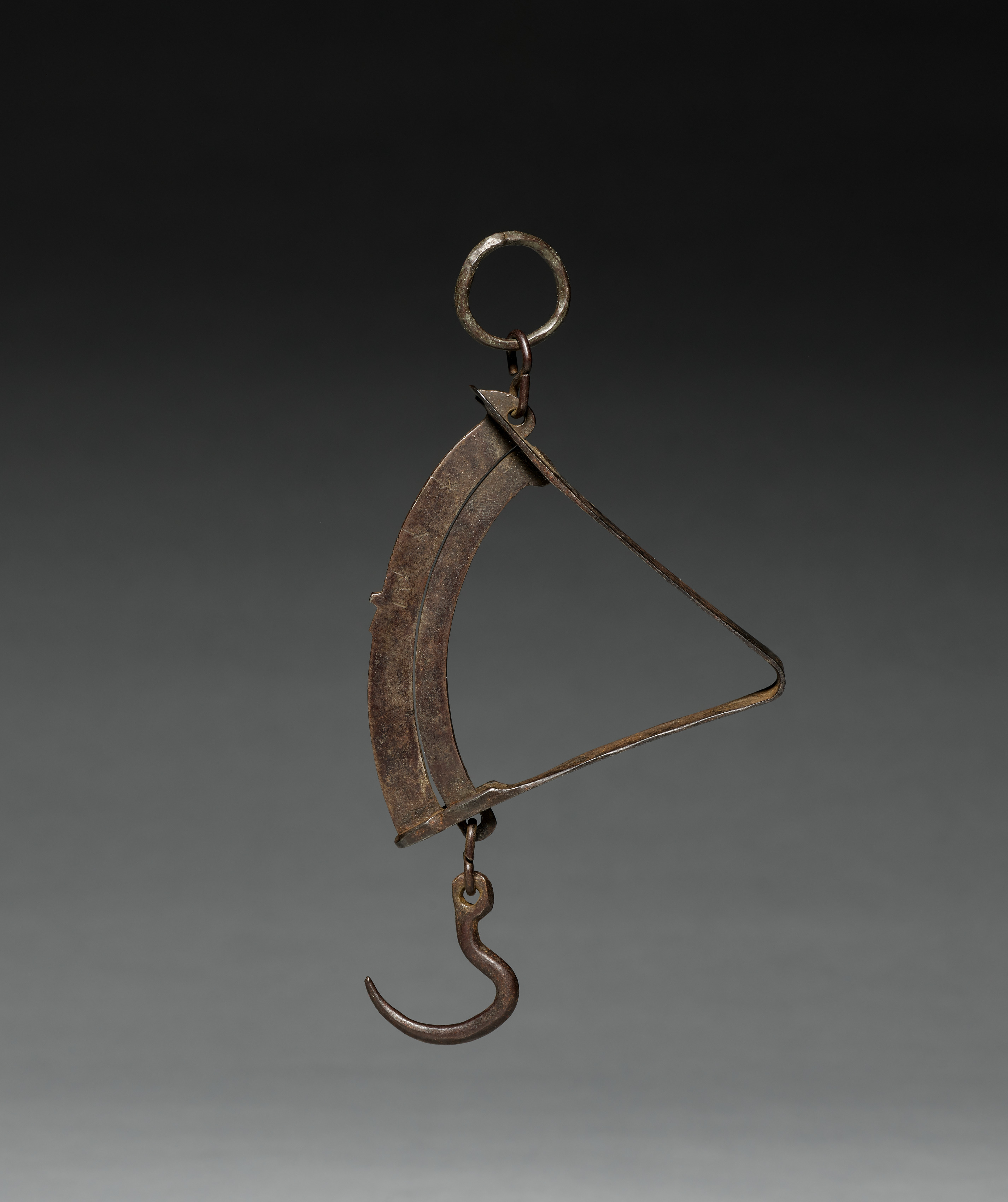 Hand Scale by unknown artist. The image shows an old, rusty metal hand scale. The scale is made of metal and has a curved shape with a hook at the bottom. A long thin metal piece connects to a ring at the top. The scale is positioned against a dark background that fades to light gray at the bottom. The metal has a dark brown patina and appears to be old and worn.