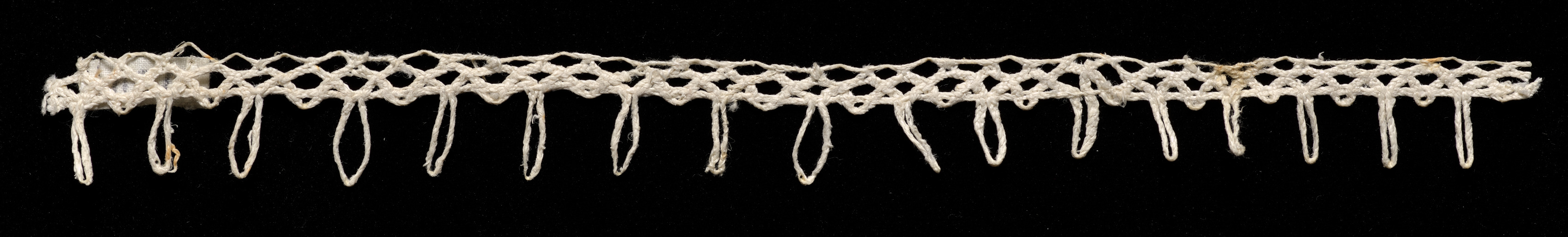 White bobbin lace edging with loops. The lace is long and narrow with a repeating pattern. The pattern consists of a mesh ground with loops hanging down from it. The loops are evenly spaced and teardrop-shaped, hanging down from the main body of the lace. The main body of the lace has a net-like appearance. The background of the image is black. The title of the image is "Bobbin Lace Edging with Loops". The artist is not visually represented. The lace appears to be made of a white or off-white thread. The loops are all roughly the same size and shape. The lace is presented against a solid black background.