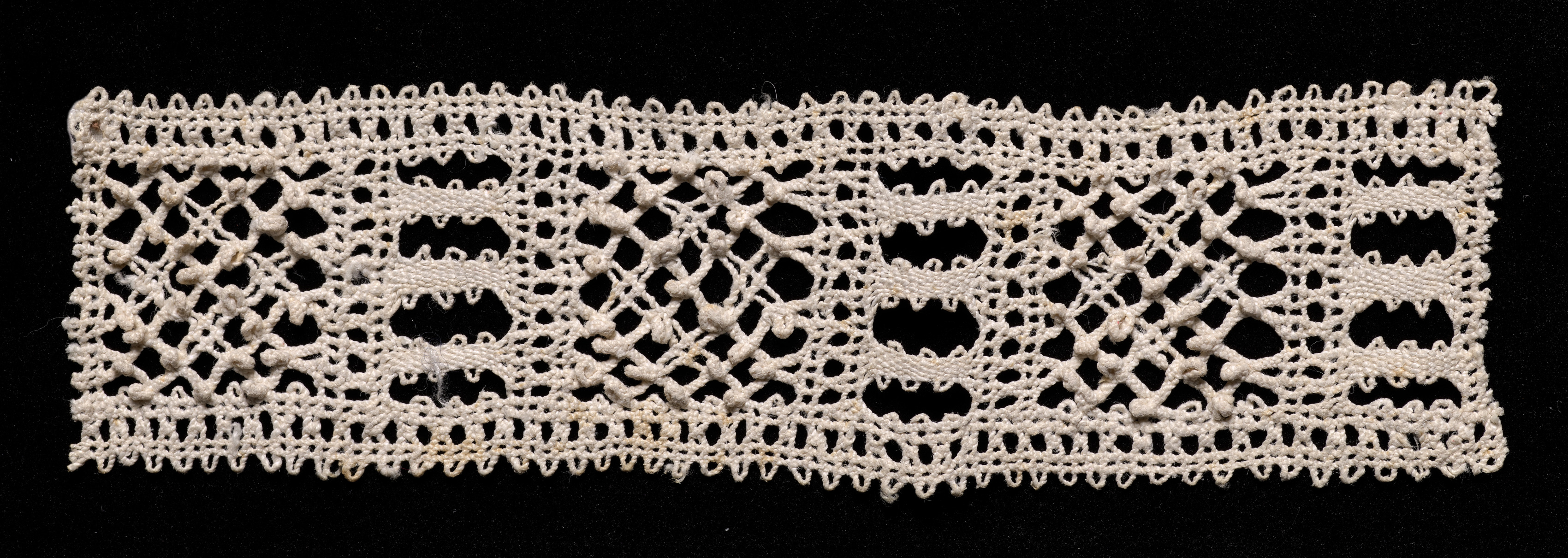 Rectangular piece of white bobbin lace with intricate design. The lace is made up of interlocking loops and stitches. Top and bottom edges have a repeating pattern of small loops. The main body of the lace features a repeating design of four rounded rectangular shapes. The background of the image is solid black. The lace appears to be made by artist associated with "Bobbin Lace Insertion".