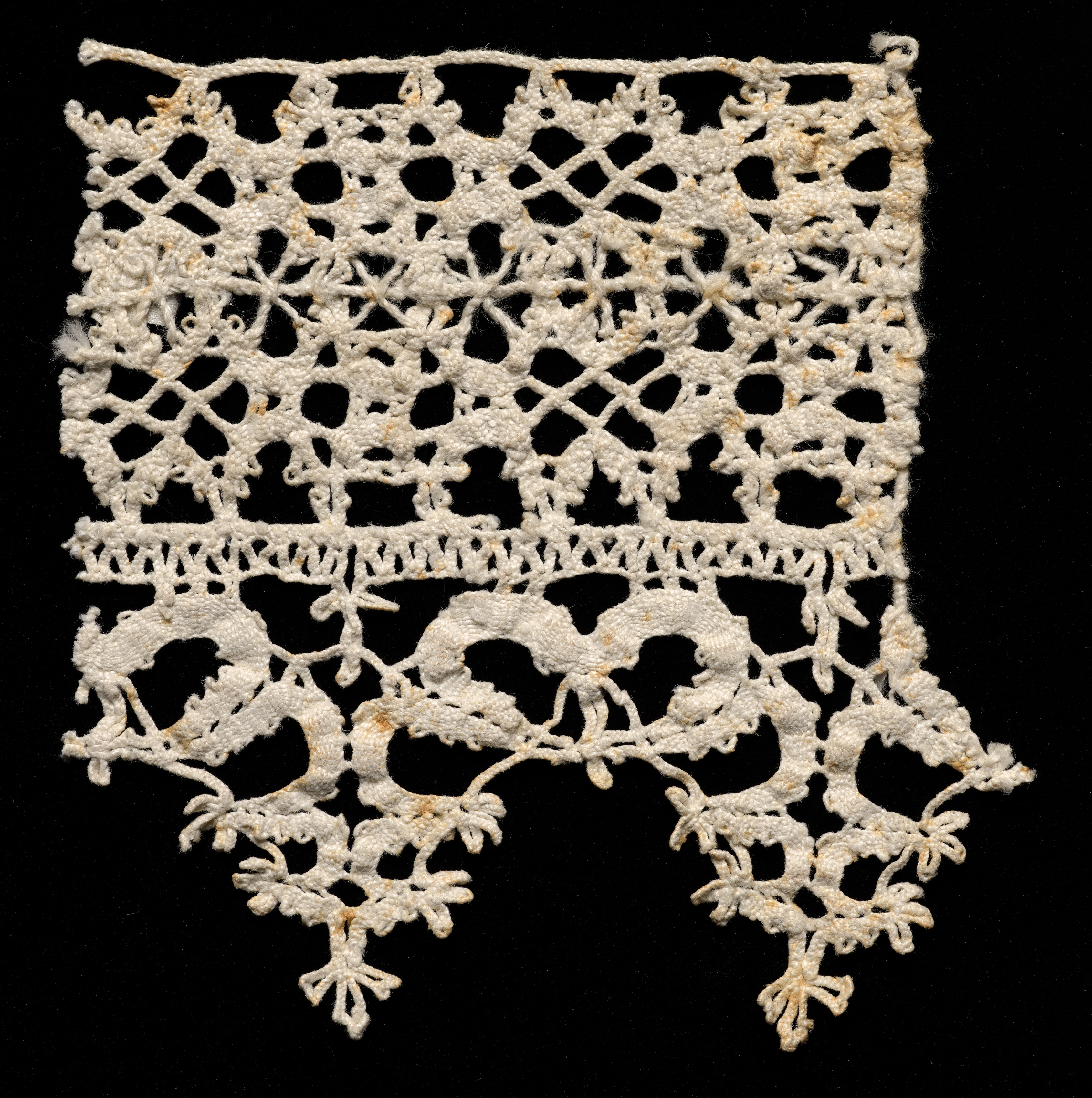 White bobbin lace with a rectangular top section and a bottom section featuring a wavy edge with points, on a black background. The top section consists of a grid-like pattern with a repeating design of interconnected diamonds and curved lines. A horizontal line separates the top section from the bottom section. The bottom section features a more intricate design with curved lines and floral motifs. The lace appears to be made of a thick, textured thread. The overall shape is rectangular with a straight top edge and a wavy bottom edge featuring pointed sections.