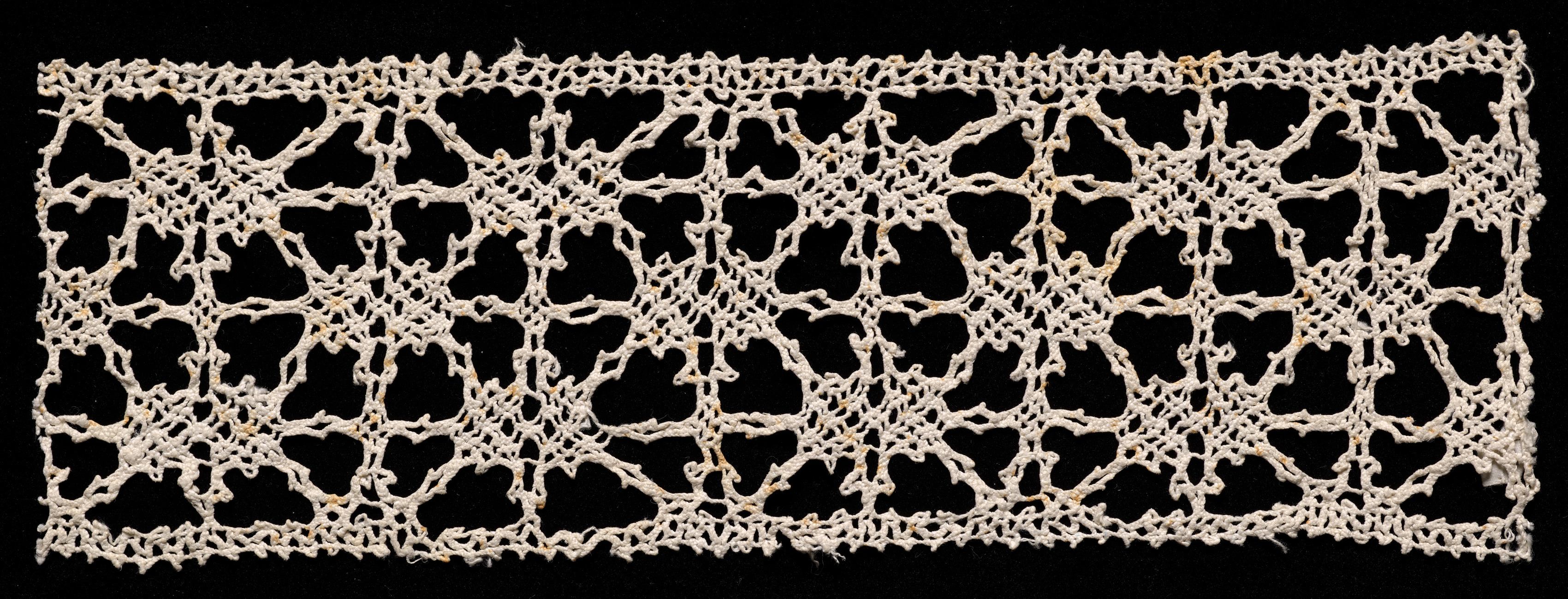 White bobbin lace on a black background. The lace is long and rectangular with uneven edges. It features a repeating pattern made of off-white threads. The design includes interconnected loops, curves, and nodes forming a web-like structure. The lace's background is filled with an intricate arrangement of knots and stitches that resemble floral motifs. The top and bottom edges have a scalloped pattern. The overall texture appears delicate and ornate. Bobbin Lace Insertion.