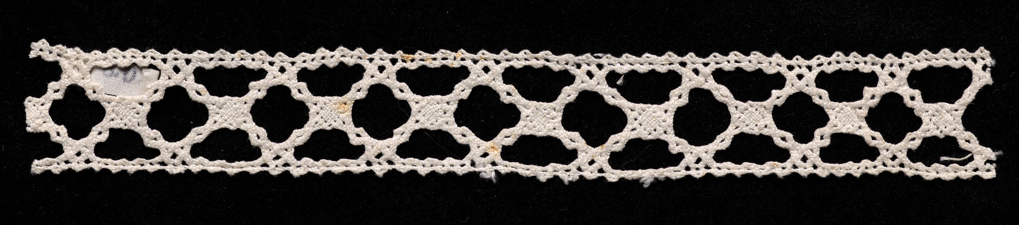 White bobbin lace with a repeating pattern of rounded shapes on a black background; long and rectangular in shape with a more textured edge along the top and bottom; consists of rows of holes and woven sections. Bobbin Lace Insertion. The lace appears to be made of a white or off-white material, possibly thread or yarn. The background of the image is black. The lace appears to be a piece of bobbin lace insertion.