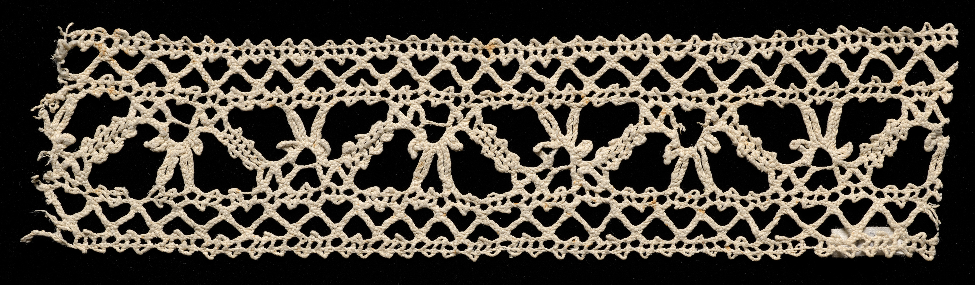 The image depicts a piece of off-white bobbin lace on a black background. The lace is long and rectangular in shape. The lace consists of rows of interconnected loops and stitches. The top and bottom edges of the lace are irregular and frayed. The lace features a repeating pattern, with sections of denser weave. The pattern within the lace includes bow-like shapes with rounded bottoms. The bow-like shapes are evenly spaced. The lace has a floral or ornamental design. The background is solid black. The piece of lace is titled "Bobbin Lace Insertion". The creator of the piece is unknown.