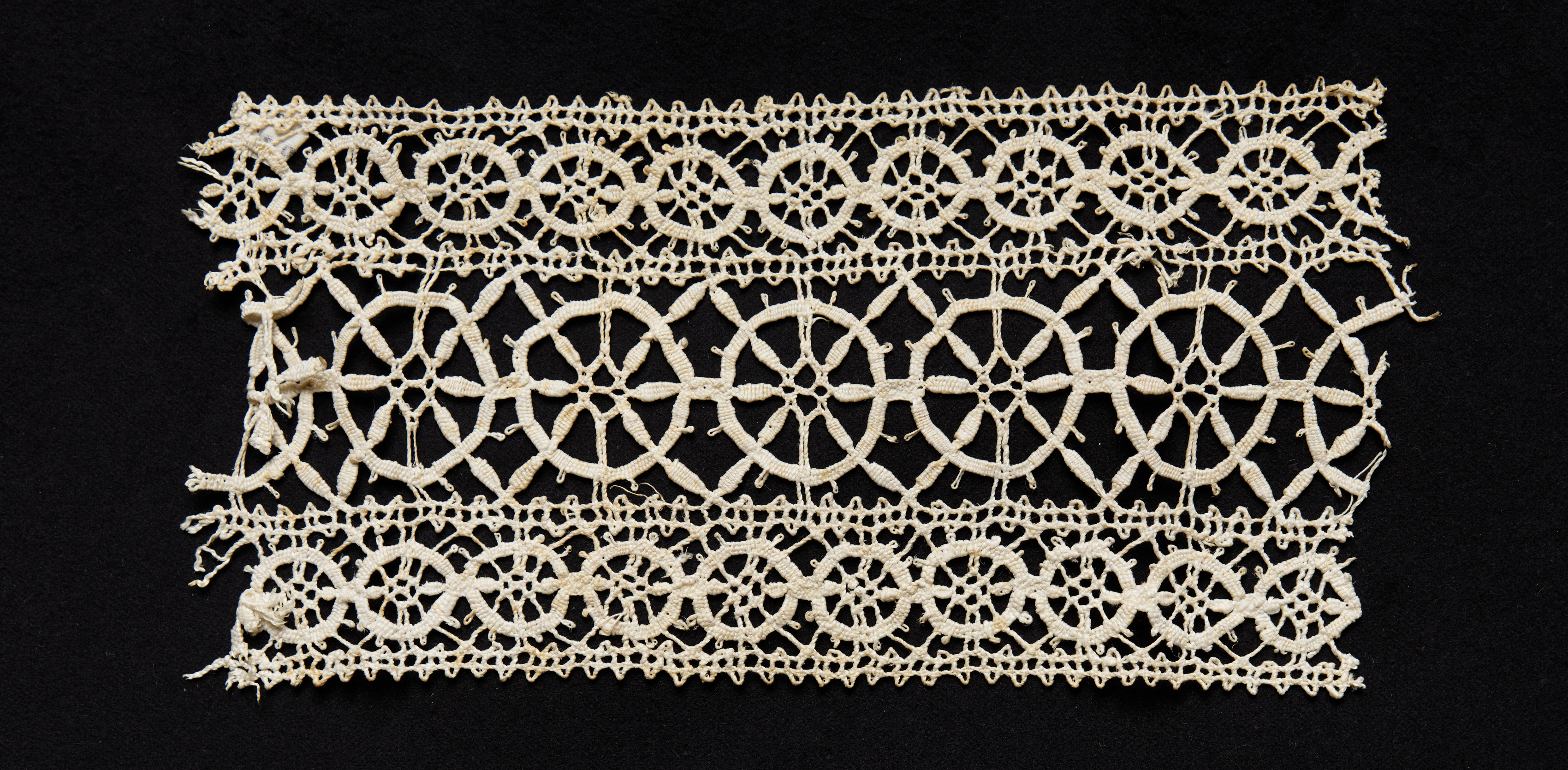 Beige-colored rectangular piece of bobbin lace on a black background, featuring intricate floral patterns and geometric shapes. The lace is made up of rows of interconnected loops and curves, resembling a repeating design of circles with spokes and floral motifs. The edges of the lace are slightly frayed and uneven. The overall design consists of horizontal rows of ornate patterns.