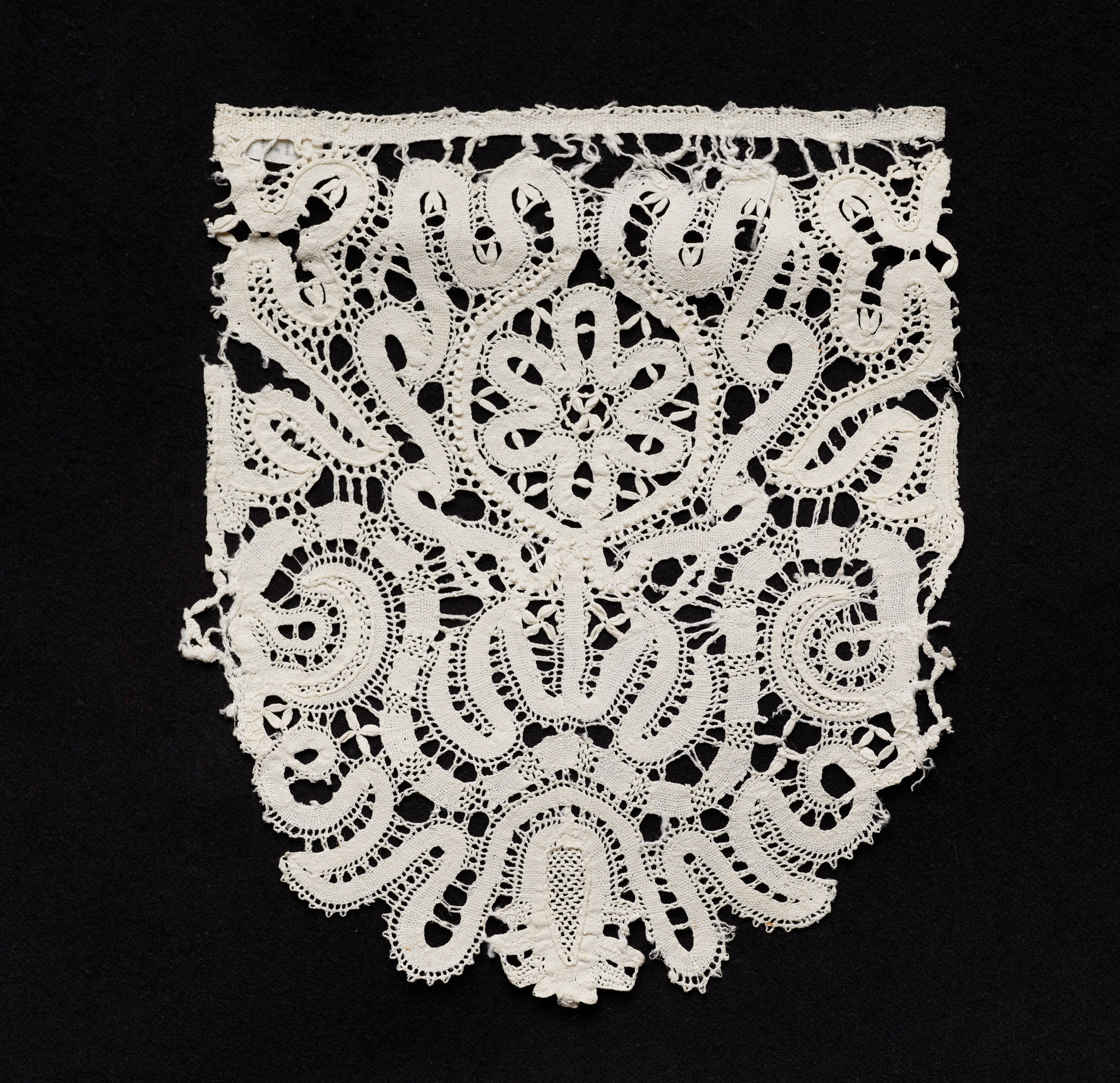 White lace piece with intricate floral and swirling patterns against a black background. The lace features a dense design with a straight edge at the top and a decorative edge along the bottom and sides. The lace is primarily composed of white thread. The lace piece is symmetrical, with a central floral motif and radiating swirling patterns. The background is solid black.