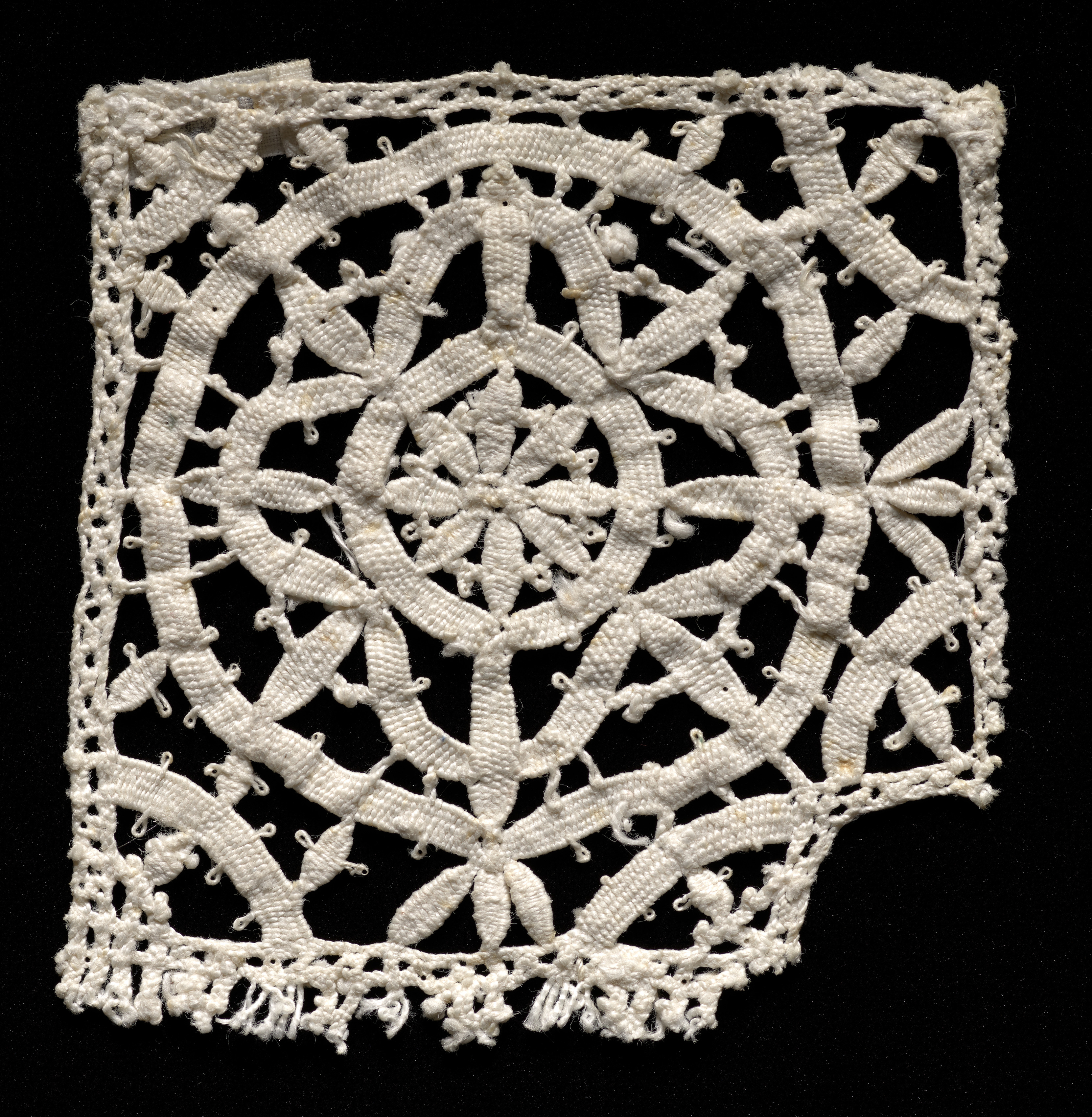 White square piece of bobbin lace with a floral design. The lace has a repeating pattern of interconnected flowers and leaves. The edges are decorative with a scalloped design and short fringe at the bottom. The background is black.