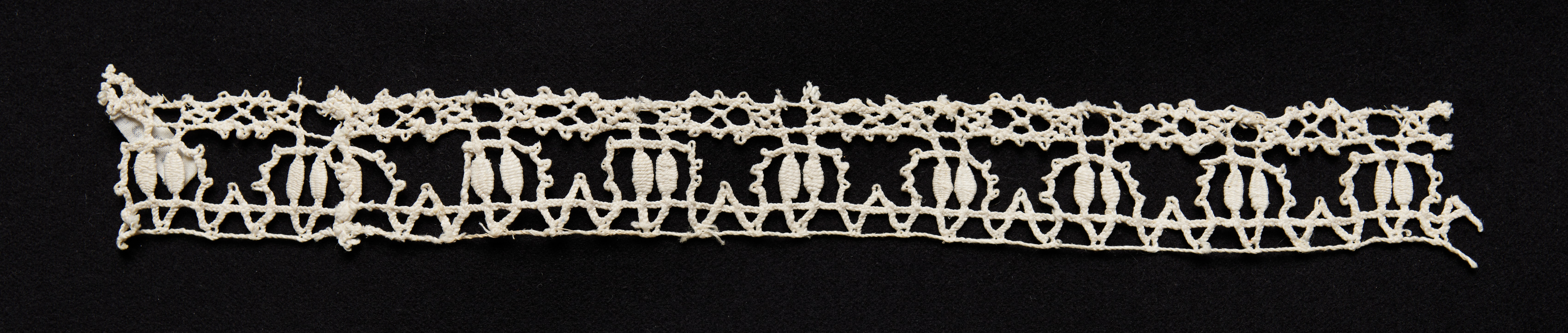 White, intricately designed lace strip with a repeating pattern on a black background. The lace features a series of oval shapes connected by threads. The design includes floral and geometric elements. The top and bottom edges are irregular. The lace appears to be a type of needlepoint design insertion, specifically bobbin lace.