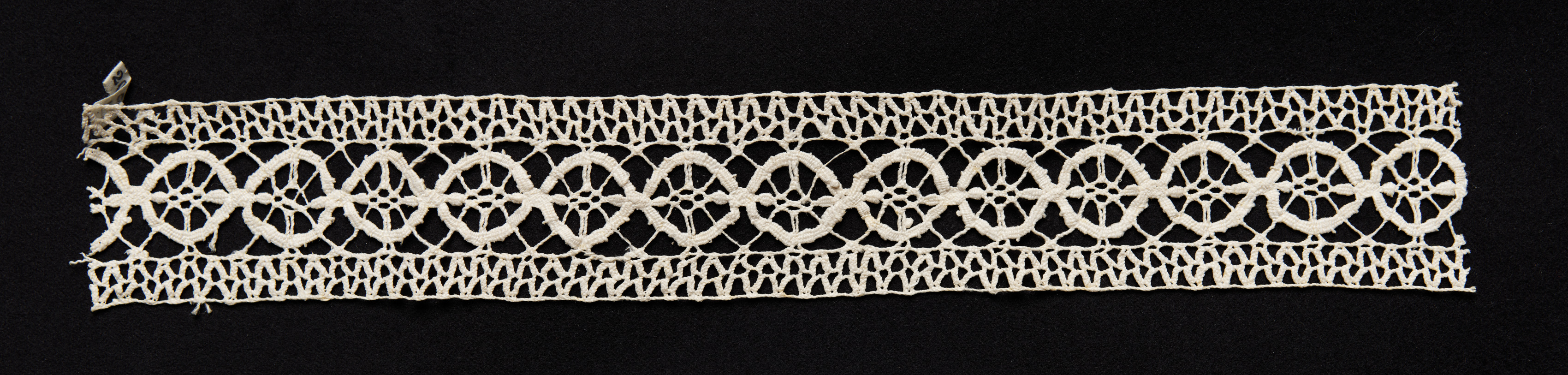 White rectangular piece of bobbin lace with intricate design, featuring interconnected circles and floral patterns; two rows of lace at top and bottom edges; one row of larger lace design in the middle; small portion of lace appears to be torn at the upper left corner; on a black background. Bobbin Lace (Needlepoint Design) Insertion.