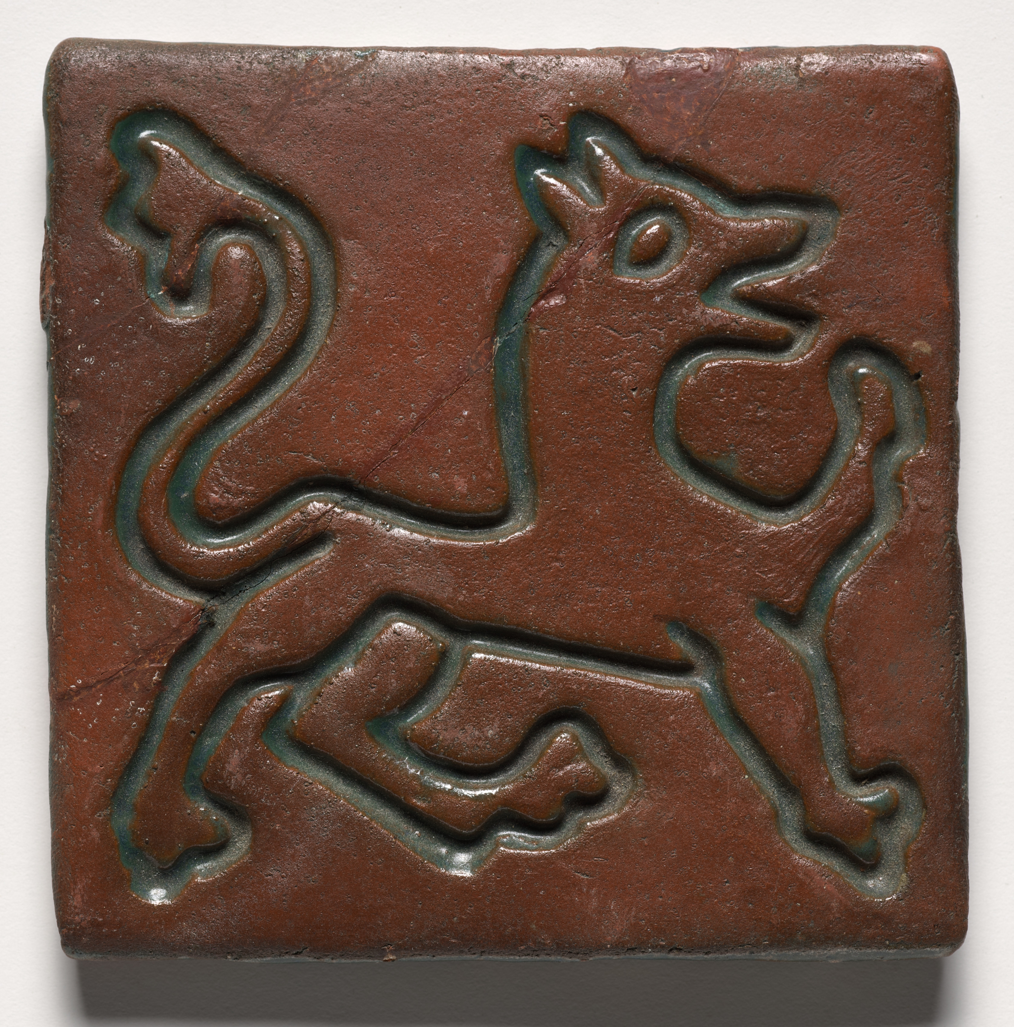 Square tile with a relief design of a dog. The tile is reddish-brown with a green glaze in the recessed areas. The dog faces right, with its head raised and tail curved upwards. The tile has a rough texture and appears to be handmade. The background of the image is white.