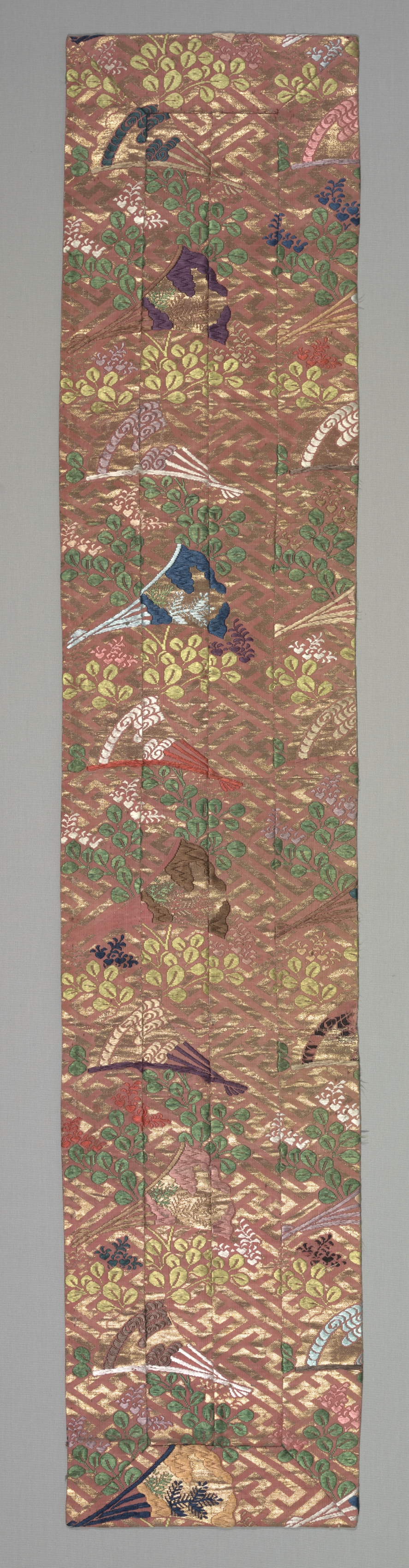 The image shows a long, narrow piece of fabric with a repeating pattern. The fabric, titled "Sash (Obi)" and attributed to an unknown artist, is brown with a repeating pattern of leaves and birds. The leaves are green, yellow, pink, and white. The birds are blue, black, white, and purple. The background of the fabric is a light brown color with a diamond-shaped pattern. The fabric is displayed on a gray background.