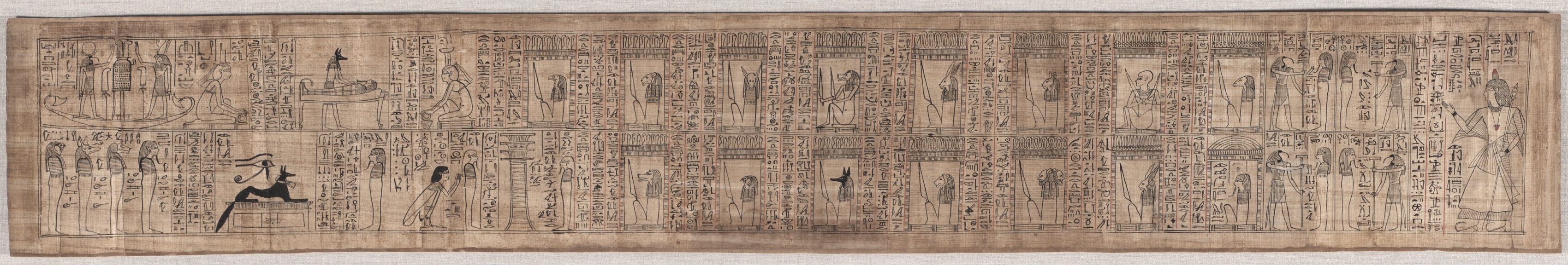 The Book of the Dead of Hori, an ancient Egyptian funerary scroll. The scroll is long and rectangular with a light brown color and darker brown edges. The scroll has 3 horizontal rows with 23 vertical sections containing black line drawings and text. The top row depicts 11 framed figures on the right and two figures on boats on the left. The bottom row on the left depicts two figures in black ink. The right side of the scroll depicts 11 framed figures and one larger figure on the far right. The scroll's surface appears slightly wrinkled and stained.