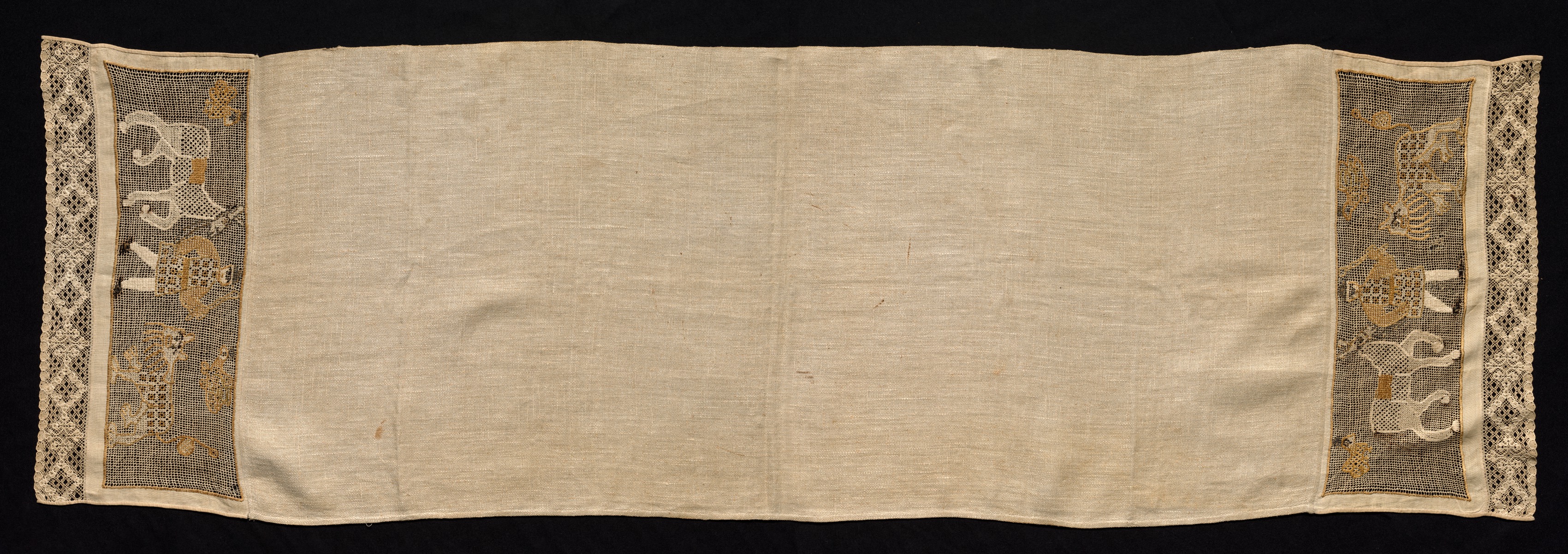 Towel with Border of Figures of Men and Animals, The towel is rectangular with slightly wavy edges, made of off-white fabric. The main body of the towel is plain with a light beige color. There are two identical borders, one on each long side, featuring a dark background with a pattern of gold and white designs. The borders contain figures of men and animals, including elephants, goats or sheep, and people. The border pattern starts with a geometric design at the outer edge, followed by a repeating motif of people and animals. The background behind the towel is solid black.