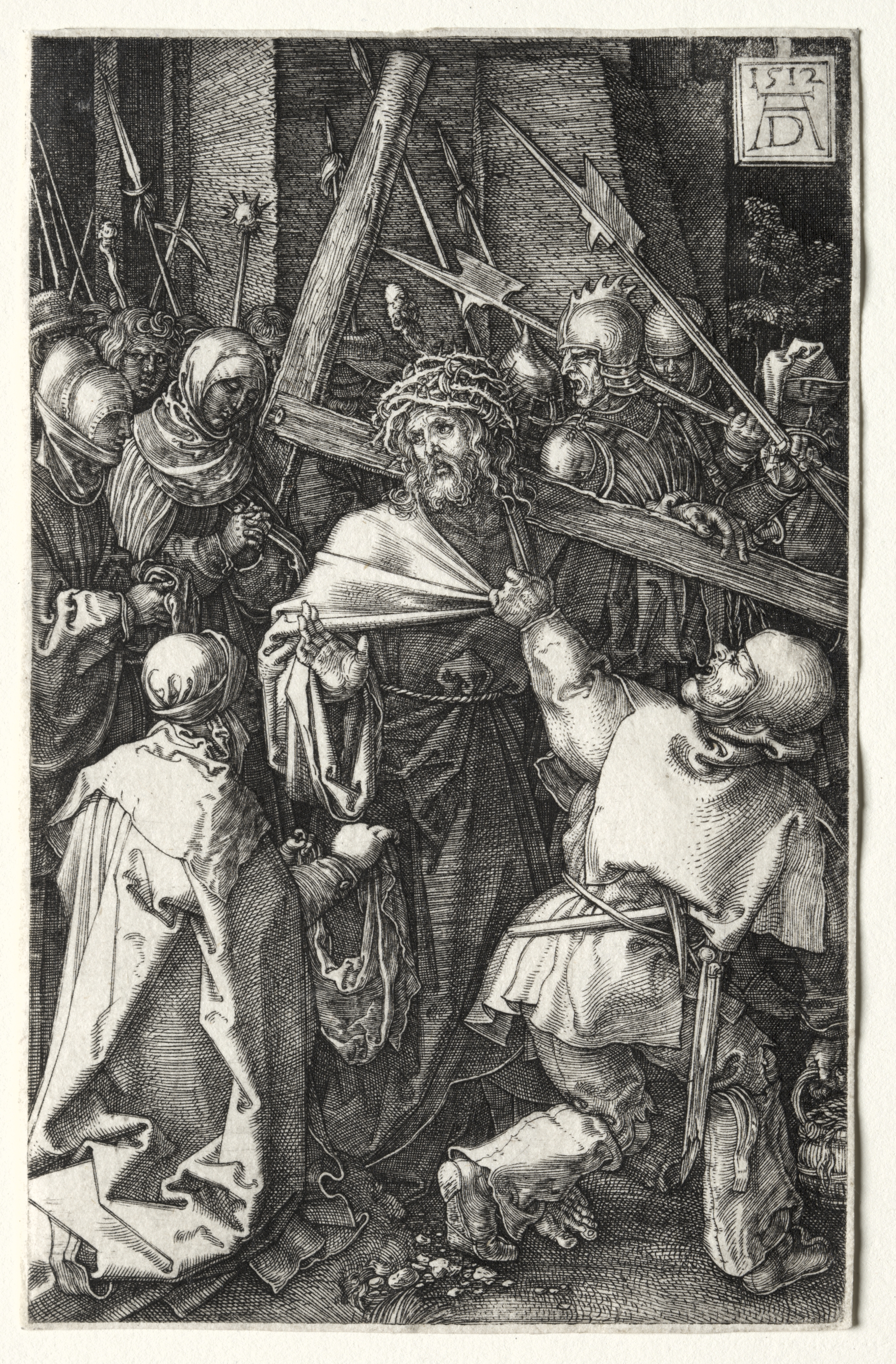 Black and white drawing of Christ carrying a large wooden cross. Christ wears a crown of thorns, a long robe with a cloth draped over his shoulder. He looks ahead with an expression of suffering, and his head is tilted slightly to the right. He walks forward with his hands on the cross for support. There are several men around him, some on horseback. Some men are dressed in armor and hold spears. The man on the right side of Christ holds the cross. The man to Christ's left seems to be falling to the ground. There are trees and a wall in the background. The image has a detailed and textured appearance. The image is framed by a white border. The drawing appears to be quite old. The top right of the image contains a monogram and date.