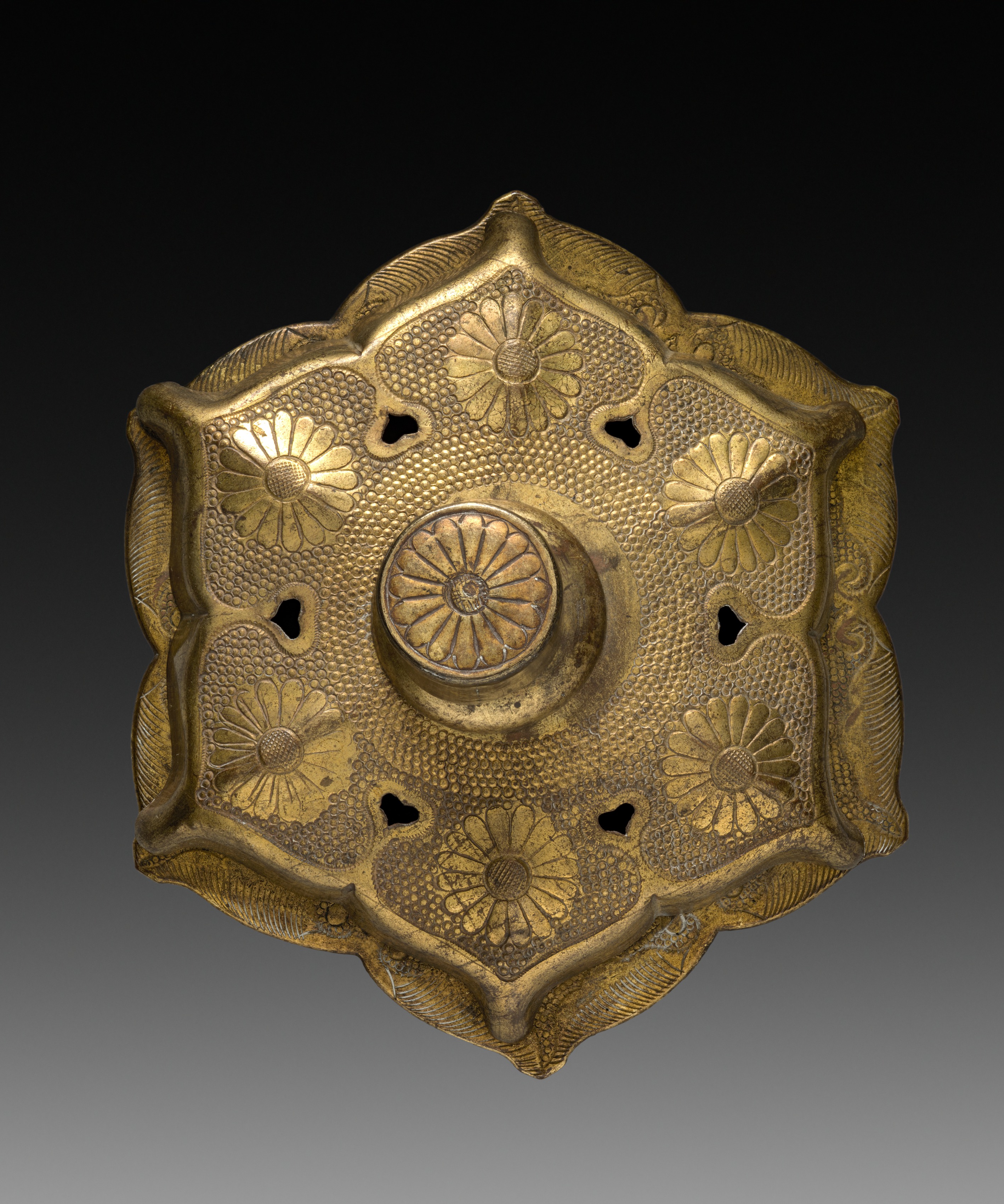 Golden-colored metal object with a central circular indentation and a flower-like design. The object is shaped like a star with rounded points. It has a textured surface with a floral pattern featuring flowers with rounded petals. The object is surrounded by a wavy edge. The background is dark at the top and light gray at the bottom. The object titled "Gilt Nail Head" by an unknown artist.