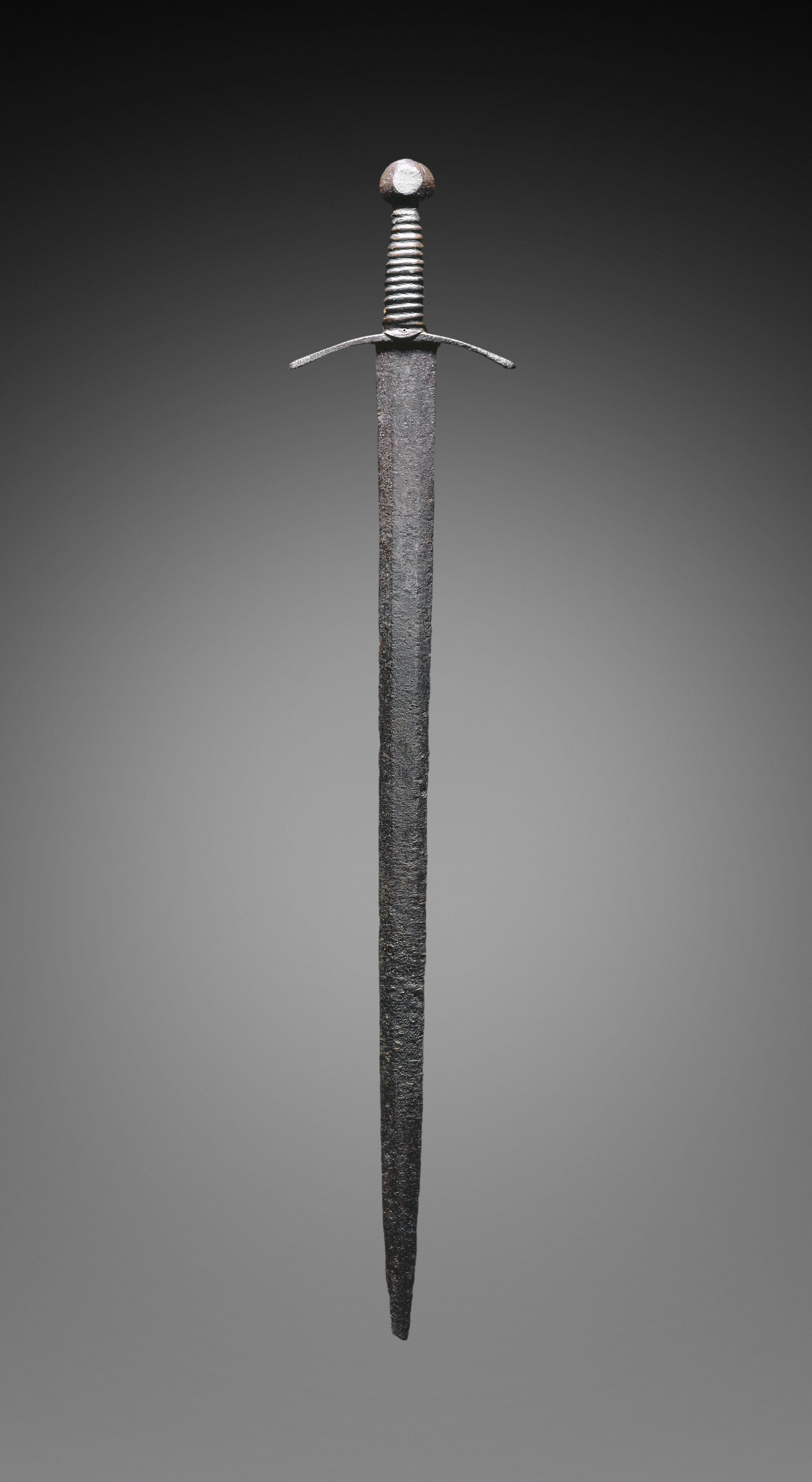 The sword has a long, narrow blade with a straight edge. The blade is dark gray with a textured surface. The blade tapers to a point at the end. The handle is wrapped in tightly coiled metal wire, with a small spherical metal piece at the top. The crossguard is straight and has a slight curve at the ends. The background is a gradient from dark gray at the top to light gray at the bottom. The sword and artist's name are "Sword".