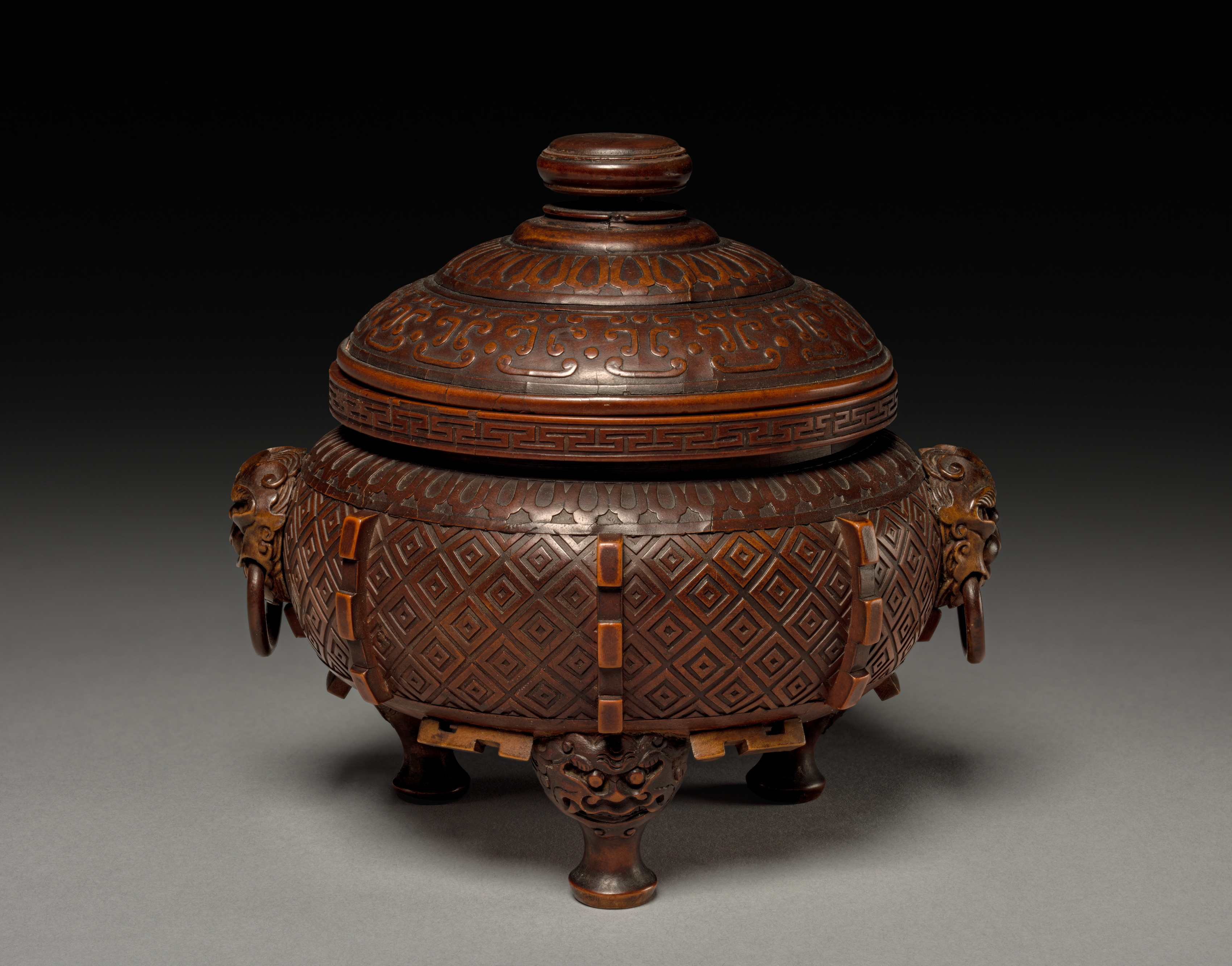 The Tripod with Cover by artist is a dark brown, wooden tripod vessel with a lid. The vessel has a round body with a wide mouth and a narrow base, resting on three short legs. The body features a diamond-shaped pattern etched into it, and there are two handles on either side, each depicting a creature's head with a long snout and curved horns. The lid is domed with a small knob on top and also features etched patterns. The background of the image is dark at the top and lightens towards the bottom.
