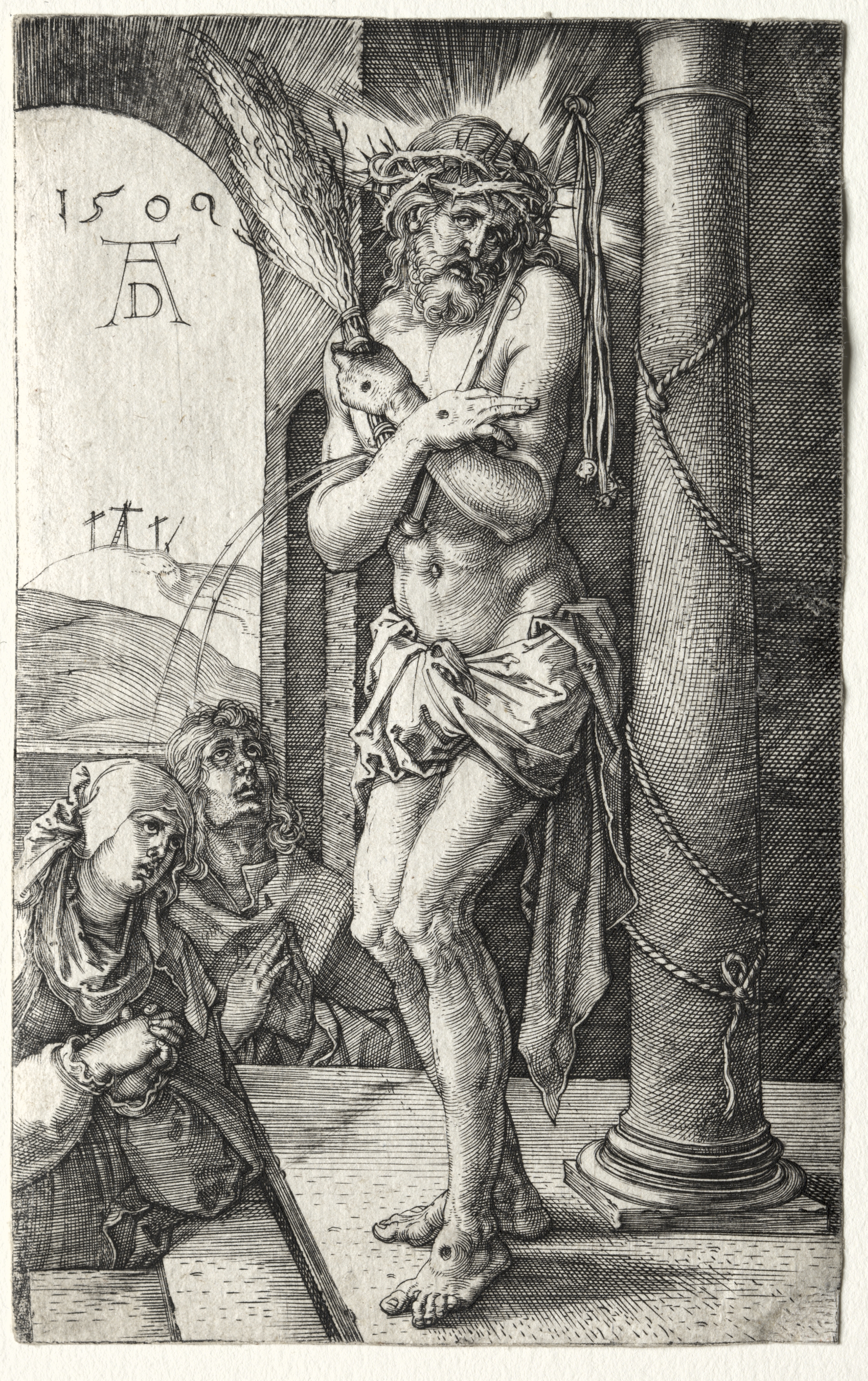 Black and white image of a man with a crown of thorns and a cloth wrapped around his waist, barefoot and with a halo of light behind his head, leaning against a column with his right leg bent at the knee and left leg straight; he holds a bundle of objects in both hands up to his chest. A man and a woman kneel on the floor on the left; background shows a hill and sky through an archway; text on the left reads "1509 AD".