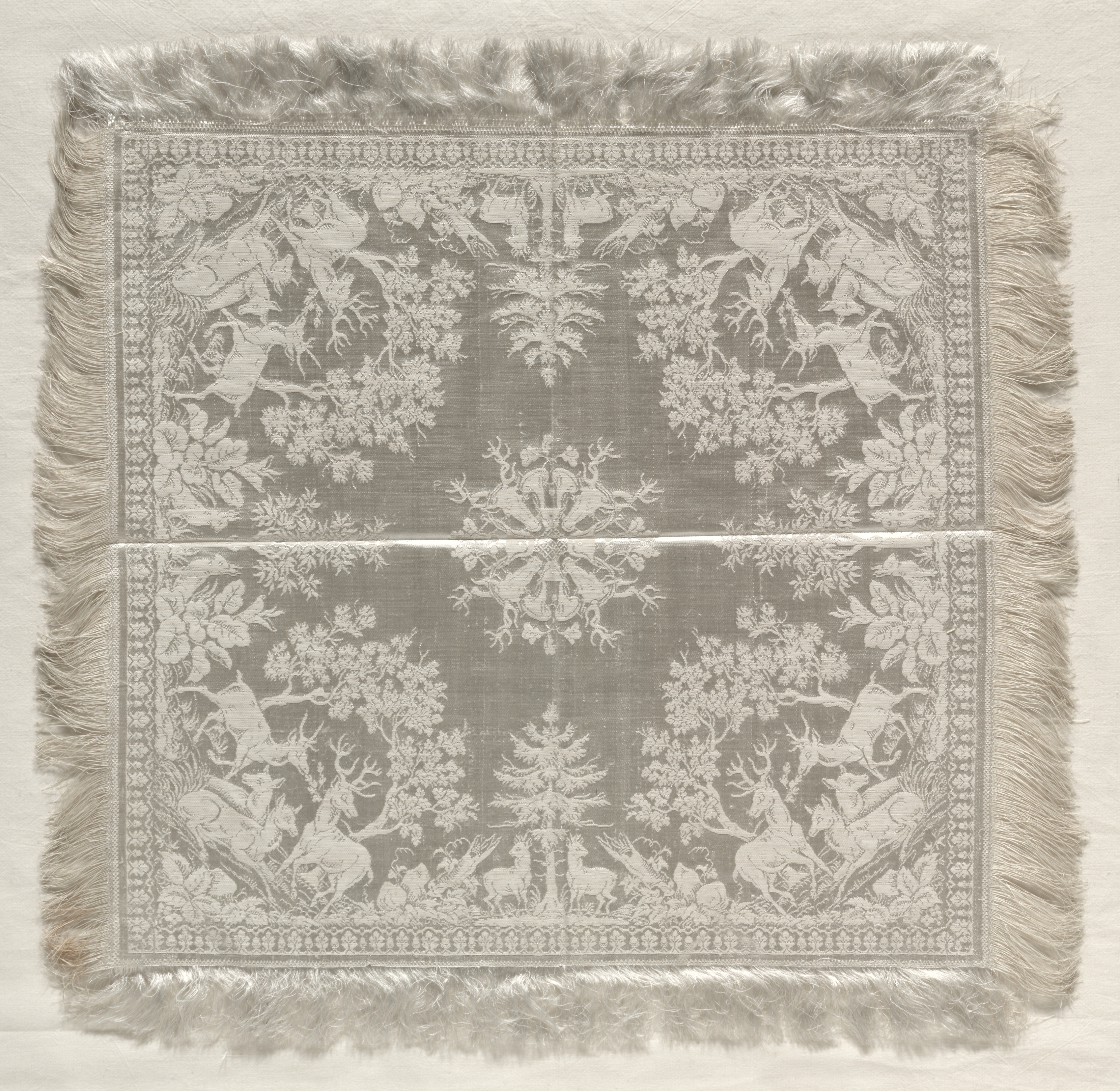 The image shows a fabric with a fringe border titled "Napkin" by an unidentified artist. The fabric is rectangular and divided into two equal sections. The background of the fabric is light gray. The fabric features a white toile de Jouy design depicting a forest scene with trees, flowers, and various animals including deer and birds. The design is repeated on both sections of the fabric. The fabric has a fringe border around all edges. The fringe is long and white. The fabric appears to be laid flat on a white surface. The surface appears to have some texture.