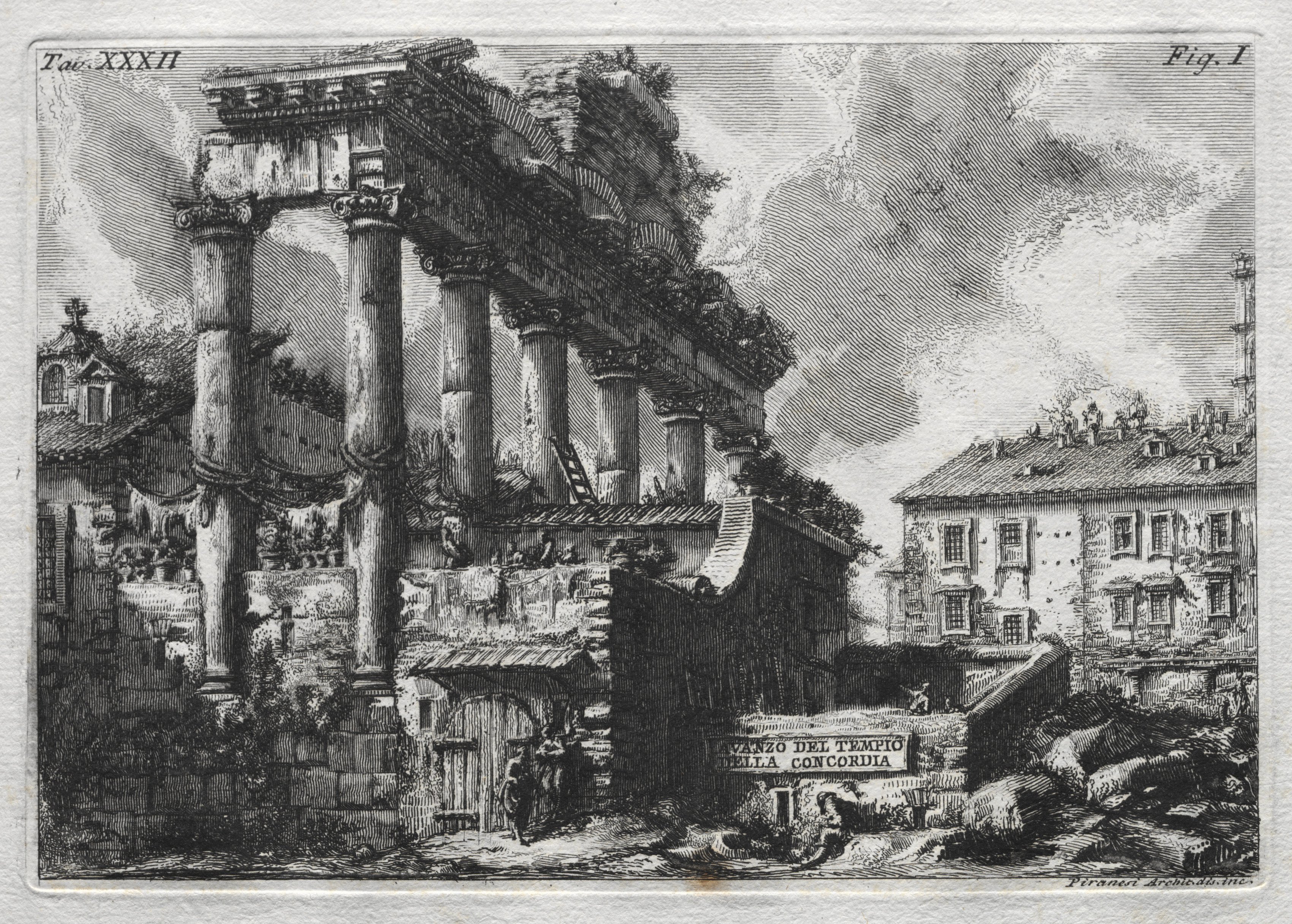 Black and white etching of ancient ruins with several tall columns on the left and a modern building on the right. Cloudy sky. A small sign in front of the ruins reads "AVANZO DEL TEMPIO DELLA CONCORDIA". A figure stands near the sign.