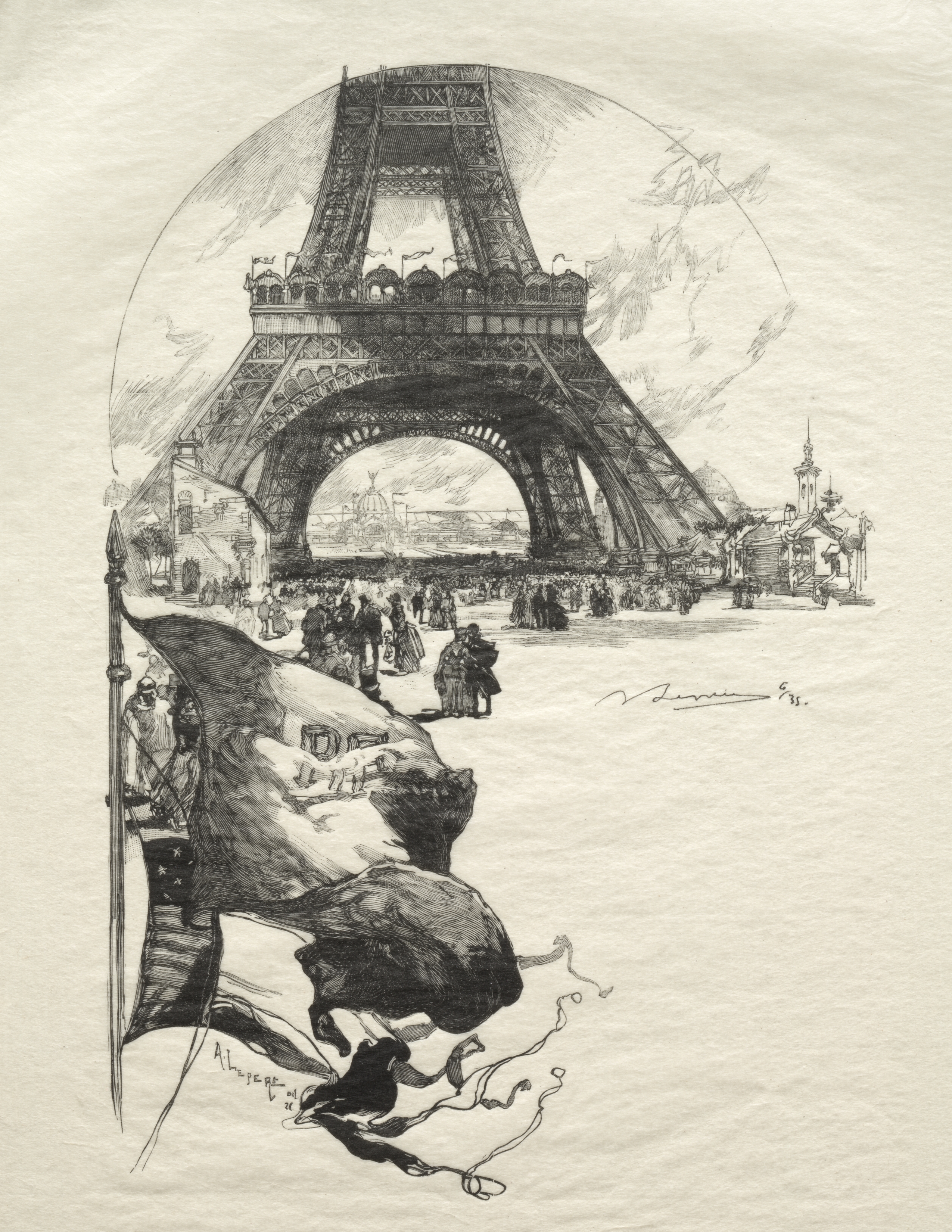 Black and white drawing of the Eiffel Tower. The tower is centered and viewed from below. It has a wide base that tapers to a point. A crowd of people in old-fashioned clothing are gathered below. In the foreground, a man appears to be falling backwards. He wears old-fashioned clothing and a hat. A javelin or spear is on the left. The background is a light beige color.
