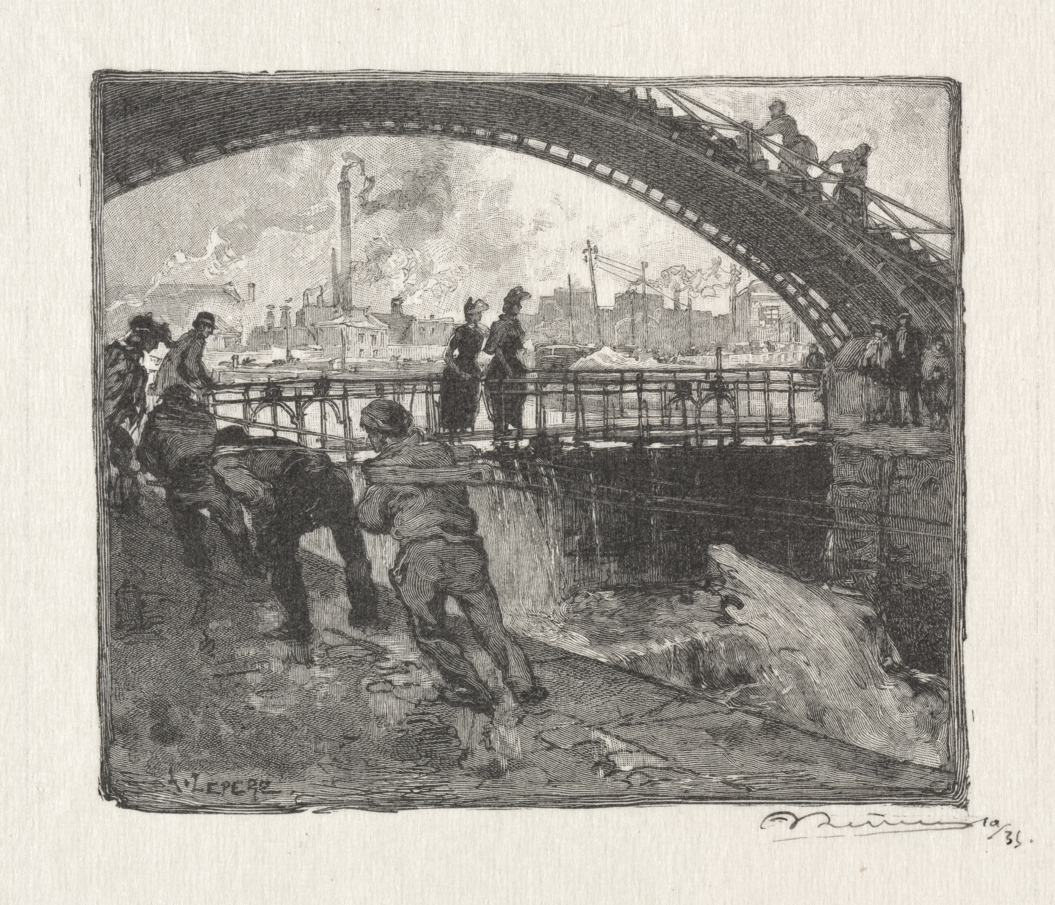 Black and white drawing of a bridge over a canal. A man is leaning over a low wall on the near side of the bridge. Two men are on either side of him on the near side of the bridge. Three people are on the far side of the bridge near the arch; one of them sitting. There are two people on the right side of the bridge on the near side of the arch. The background shows a cityscape with buildings, smokestacks, and smoke. The drawing depicts a scene near a canal lock.