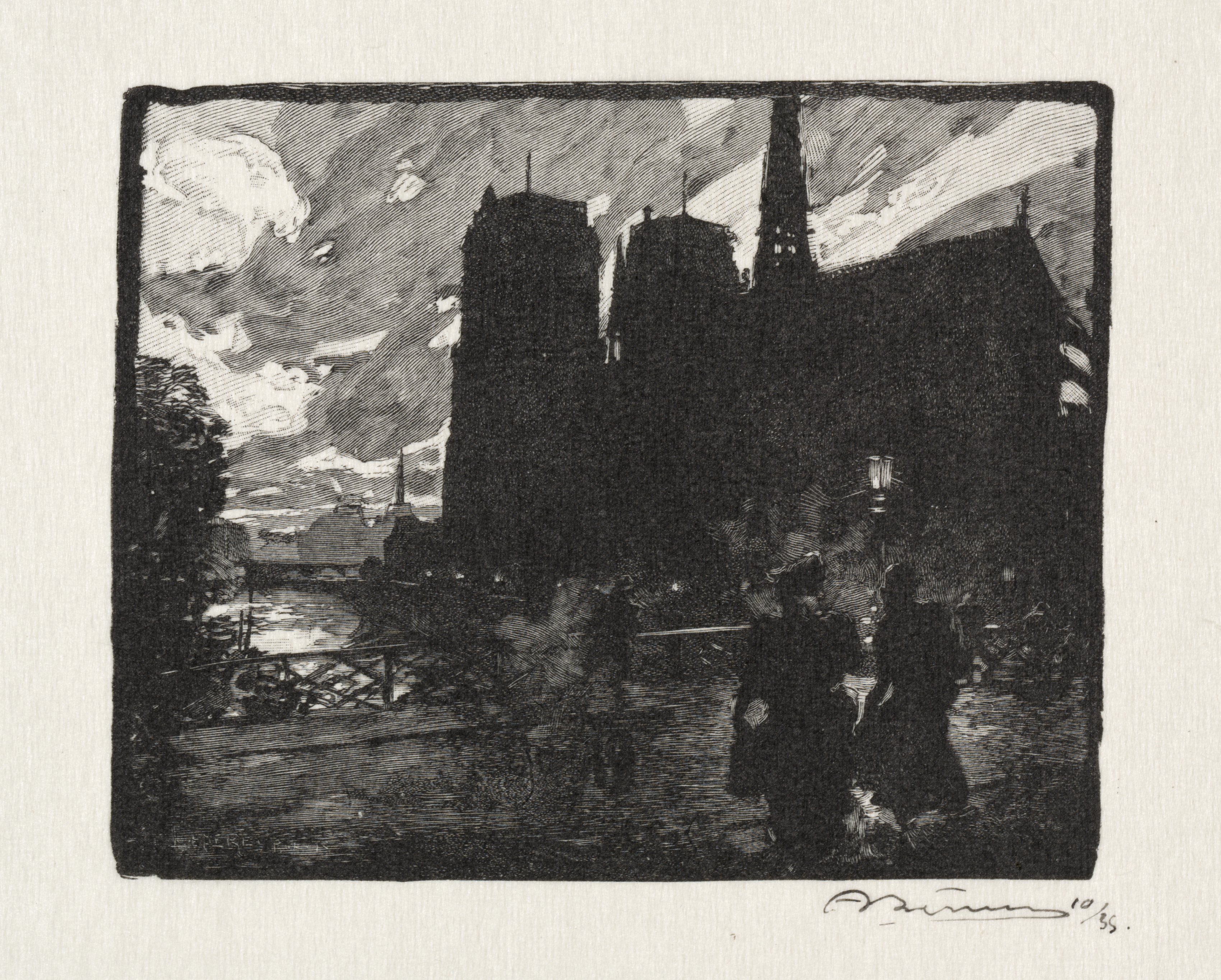 The image depicts a black and white scene of a cityscape at night. A large building with two towers and a spire dominates the right side. The building appears to be a church or cathedral. In the foreground, people walk along a sidewalk. A body of water and another bridge are on the left. The sky is cloudy. The artist's signature is in the bottom-right corner. The title of the piece is "Notre Dame, le Soir" and the artist is Auguste Louis Lepère.