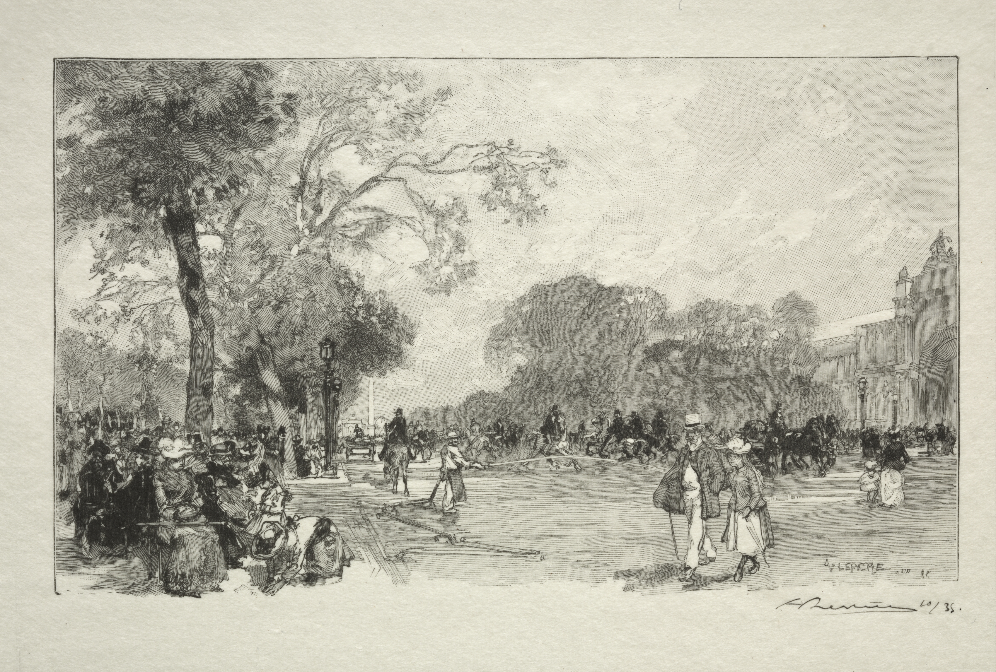 Black and white drawing of a wide street with trees along the left side. A few people sit under the trees. The right side shows a large stone building. A man rides a horse in the background. Many people walk along the street. A man sweeps the street. A man and woman walk arm in arm. Buildings are in the background. The sky is cloudy. Two signatures are at the bottom right.