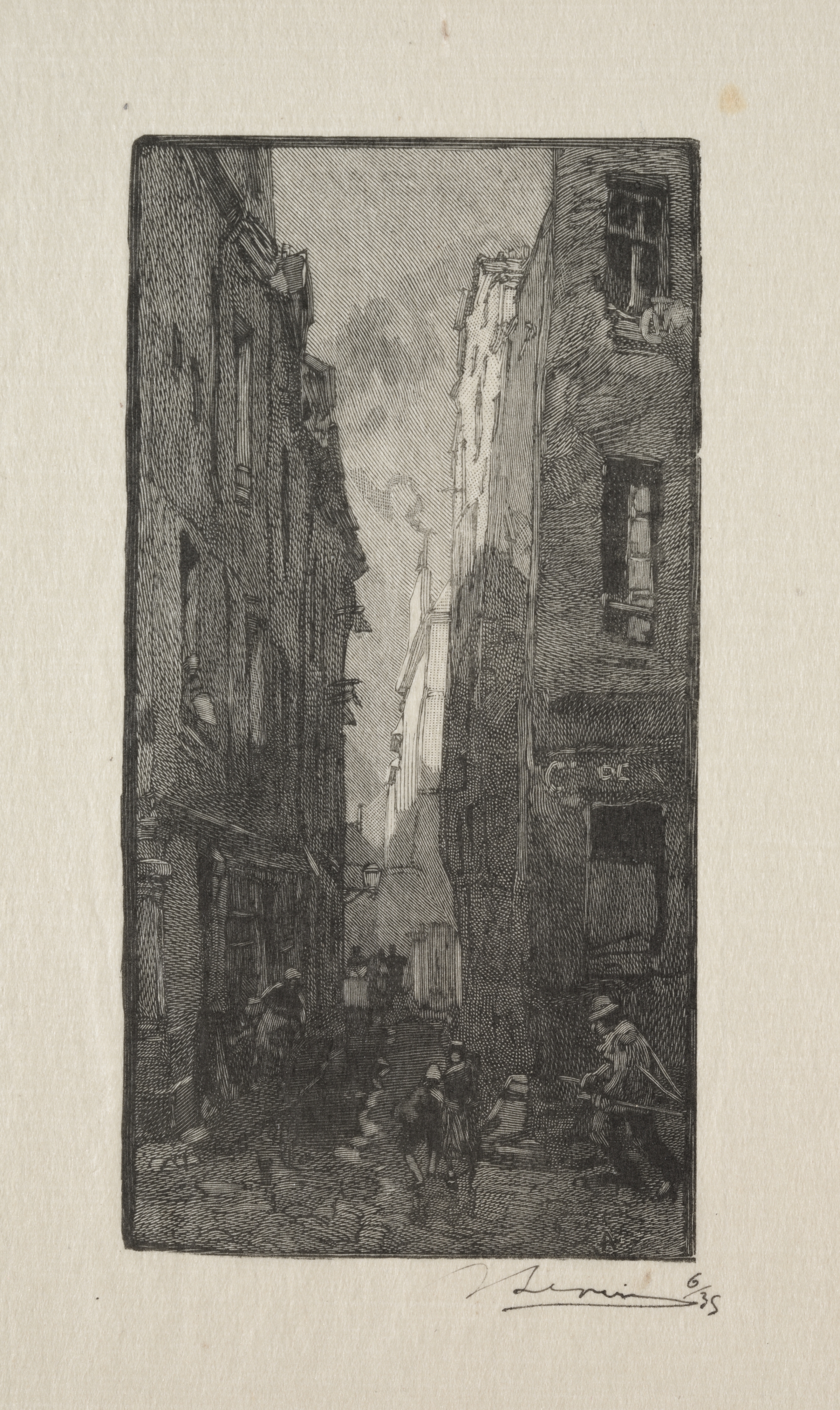 Black and white etching of a street scene. A narrow cobblestone street with tall buildings on either side. The buildings are densely packed with multiple windows and some awnings. A woman and child on the left and a man on the right. The man bends over to pick up something. The woman holds a basket. The child stands beside her. The background shows more buildings and a hazy sky. The artist's signature is at the bottom.