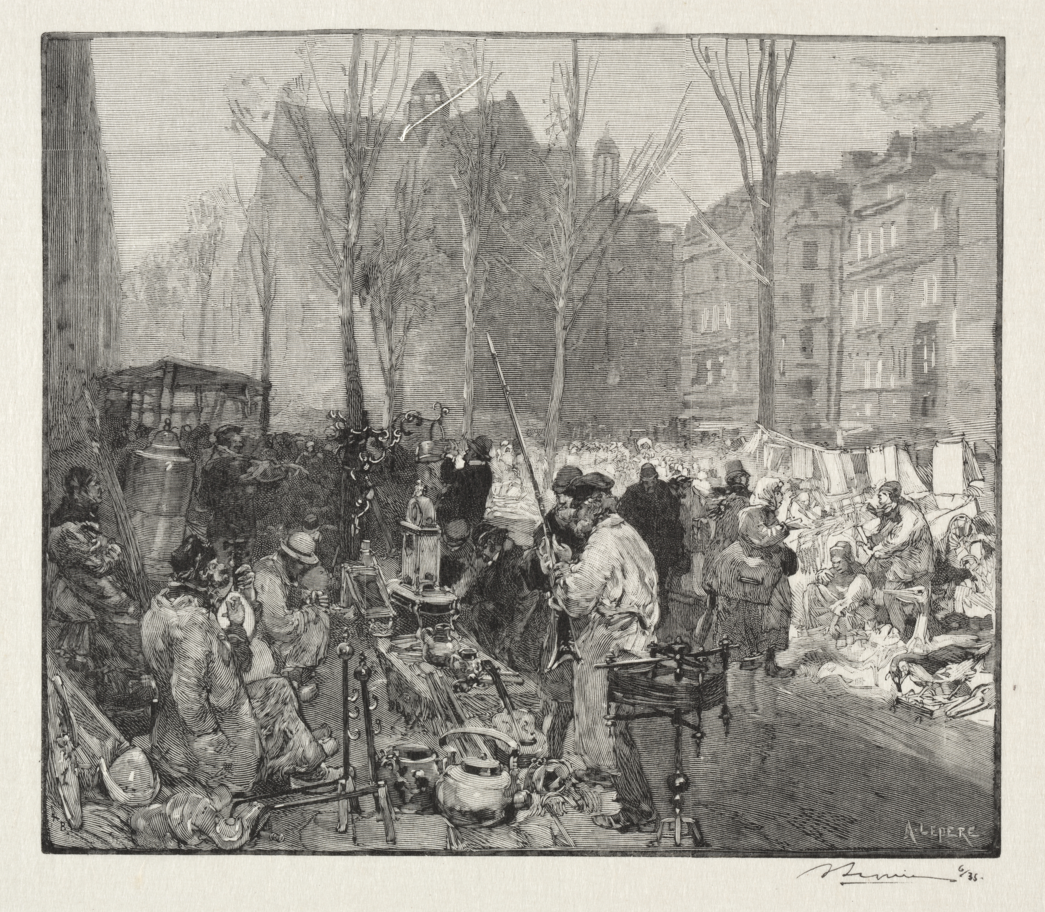 Black and white image of outdoor market scene. People are gathered around outdoor tables. The tables have various items on display. Many people are sitting and a few are standing. There are bare trees in the background. There are buildings on the right and center background. The buildings have multiple stories and many windows. There appears to be another market on the right. The image is framed with a thin black border. The image sits on a thick off-white border. The image is signed in the lower right.