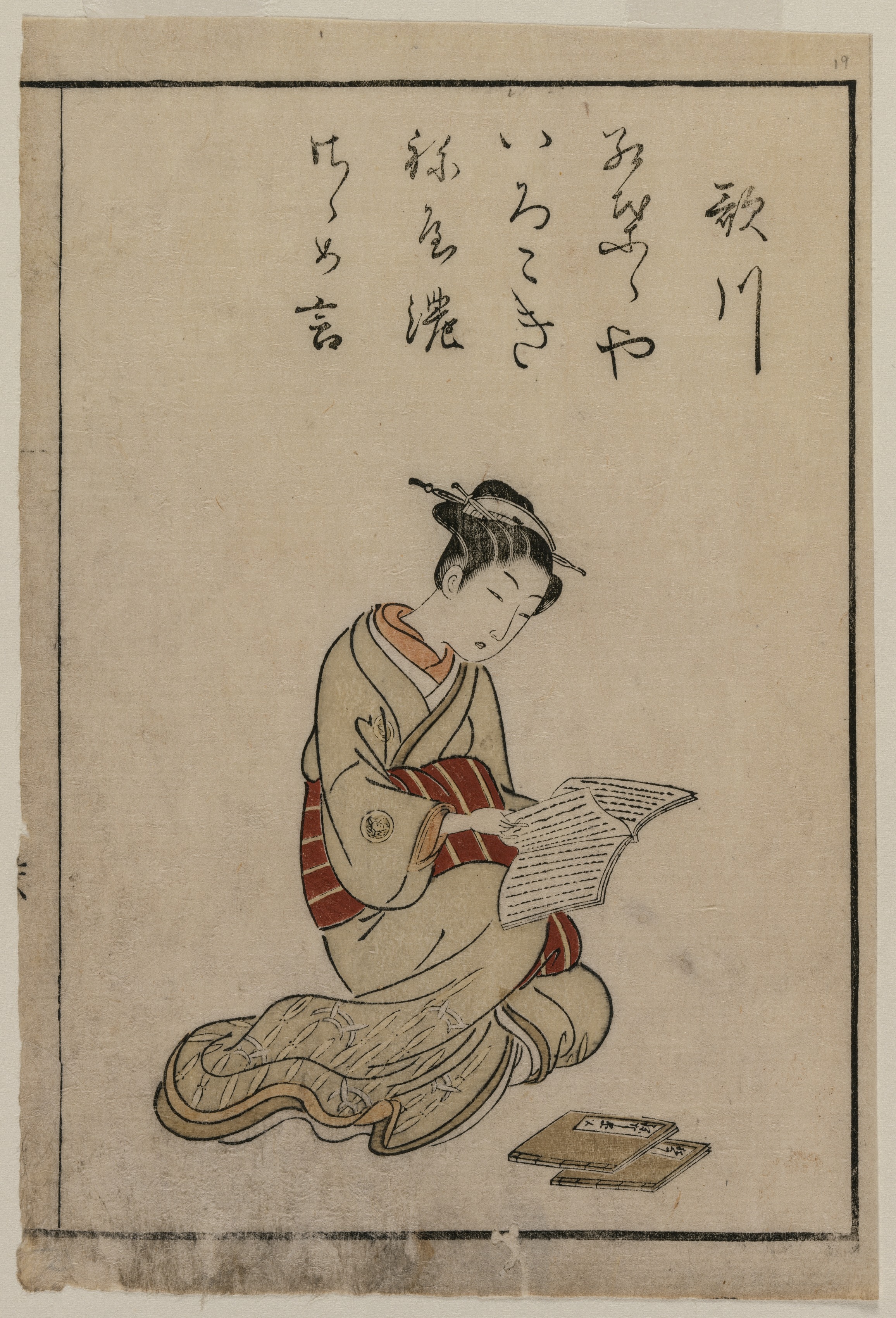 A woman sits on the floor, cross-legged with her right leg tucked under her left, wearing a traditional Japanese kimono with a red and white striped obi; the kimono is beige with red accents. Her hair is pulled up with a bento pin on top. She reads a book, with two more books beside her. The image has a thin black border and some Japanese characters written in black ink at the top. The background is a light beige color with darker edges.