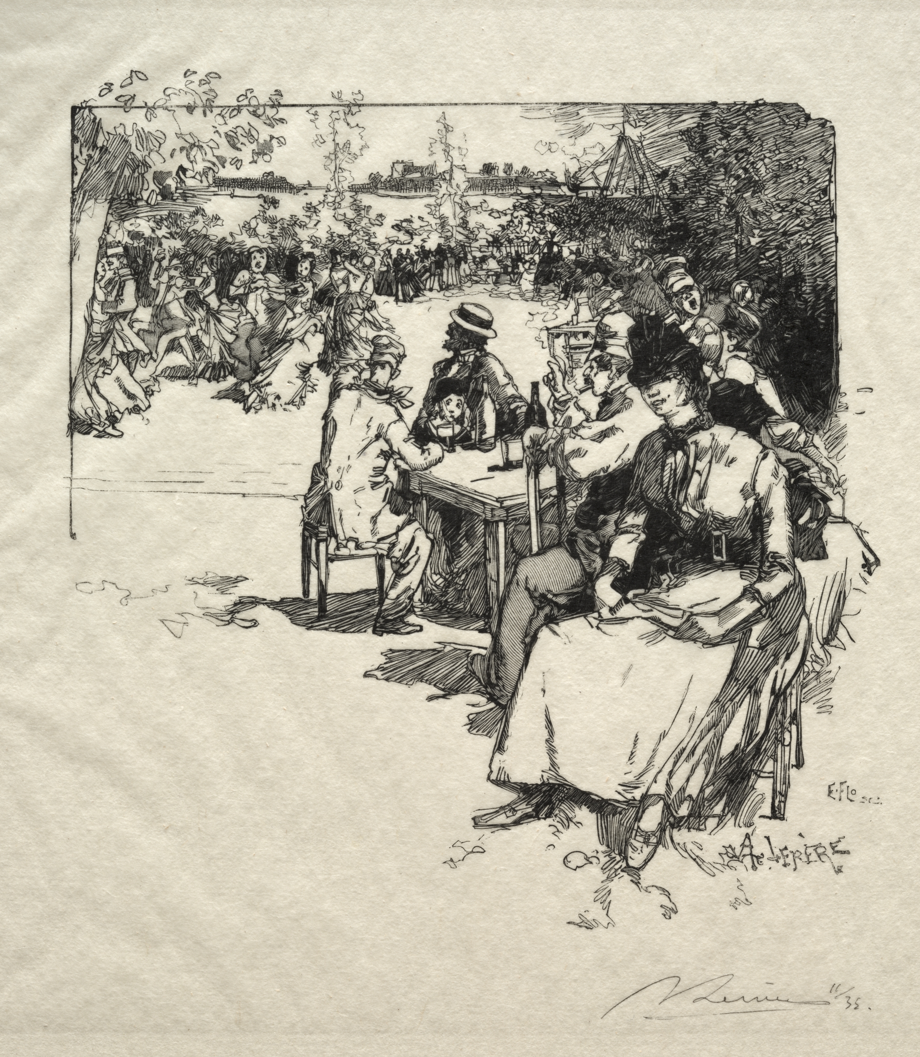 Black and white drawing on paper of people sitting and standing outdoors at a ball. A woman wearing a long skirt sits on the right side, and four people sit around a table behind her. People dance in the background on the left and right. A tree is on the left, and foliage on the right. Buildings are in the background. The drawing is signed.