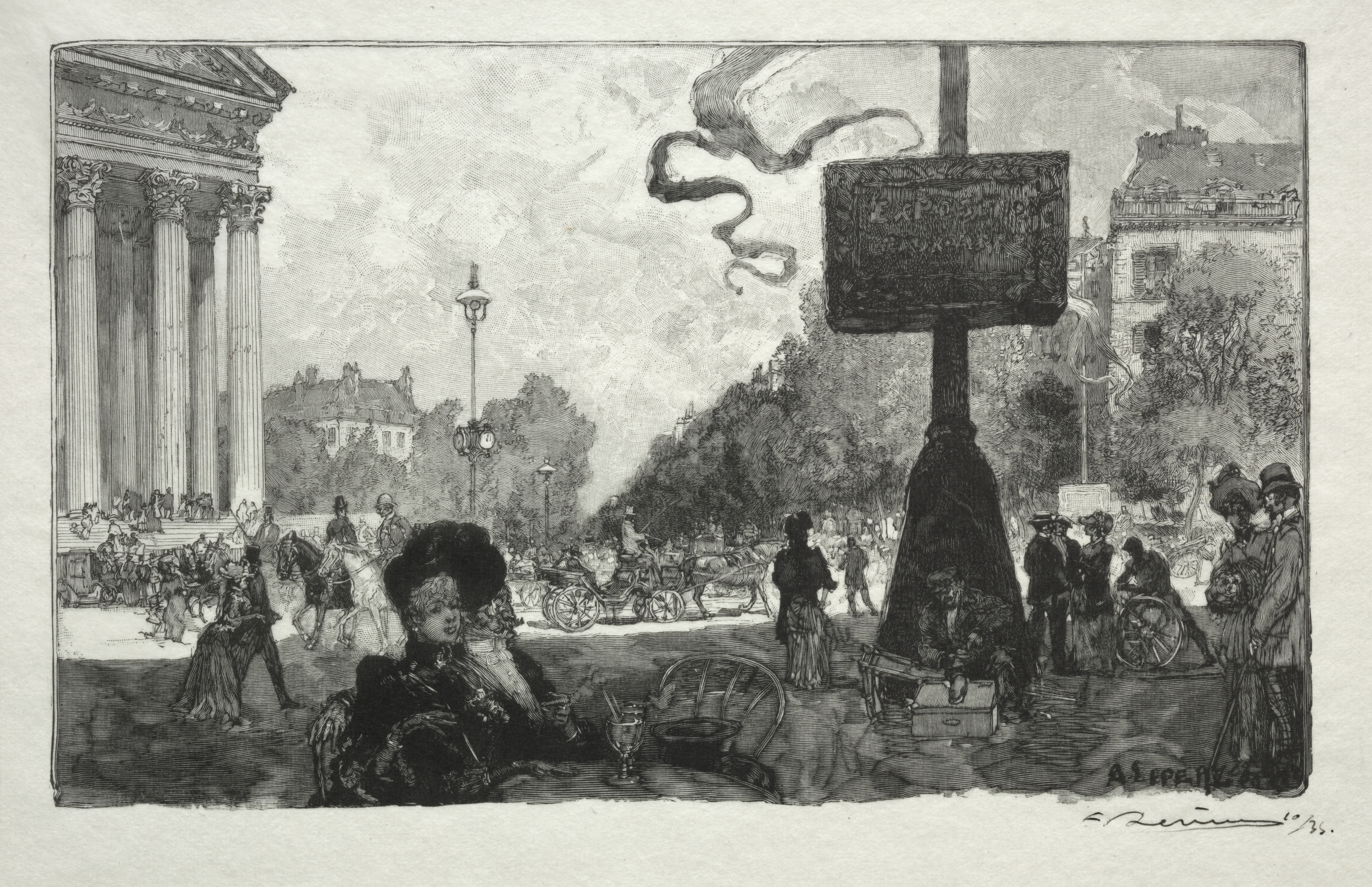 Black-and-white drawing of a street scene with people. A man and woman seated on a bench closest to viewer. Behind them, a man on a sidewalk and a woman on a chair. A sign on a post behind them. A row of columns to the left. Horse-drawn carriages on the road. Buildings on both sides. Trees on right behind sidewalk. Cloudy sky. Man and woman in old-fashioned dress. Man has mustache. Woman has large hat. Buildings have European architecture. Street lined with old-fashioned street lamps. People dressed in late 19th or early 20th century clothing. Drawing titled "Coin de la Rue Royale" by Auguste Louis Lepère.