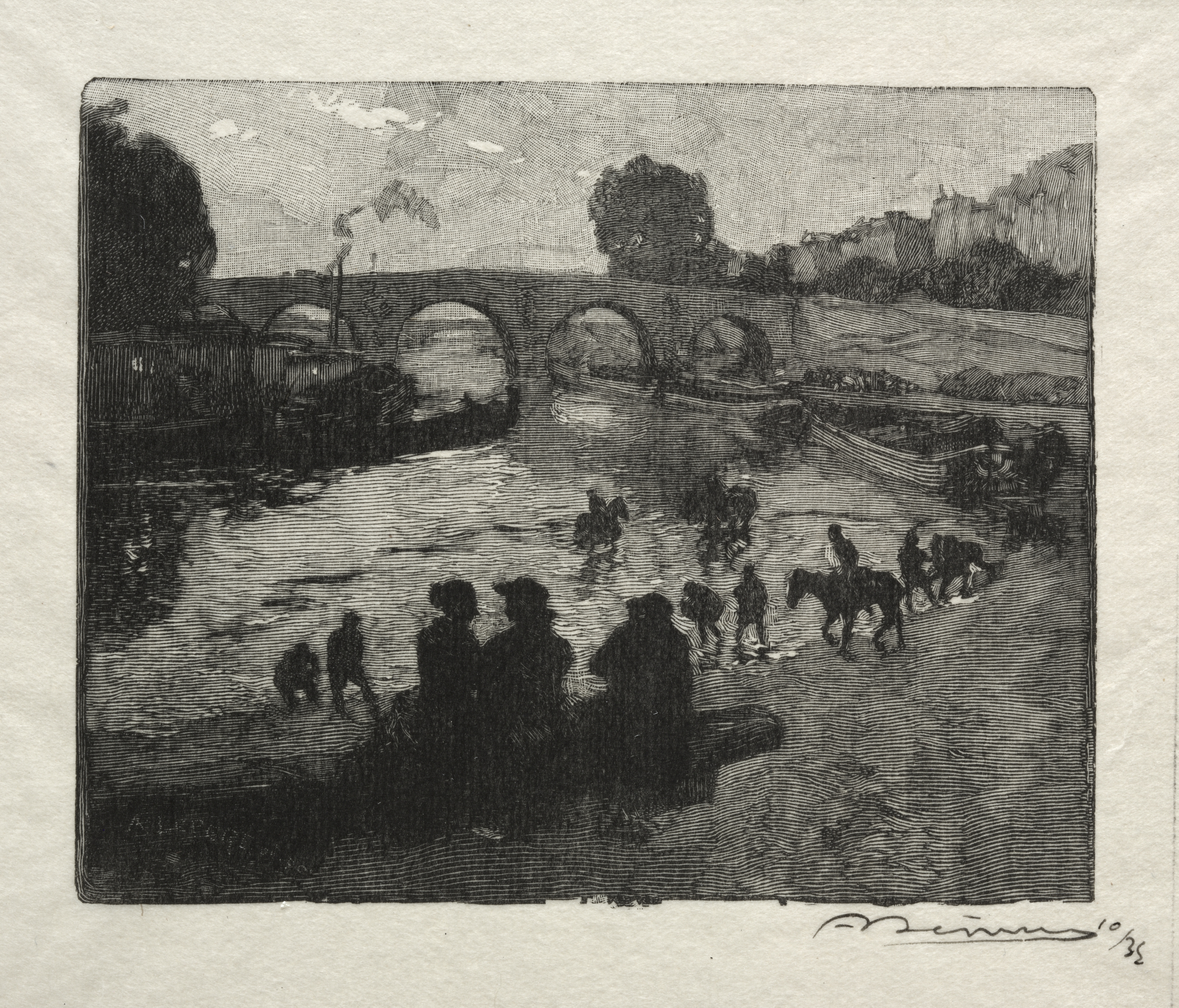 Black and white drawing of a bridge over a body of water. The bridge has three visible arches and is made of stone. It has a flat top with a railing on either side. There are trees on both sides of the bridge. On the near side, people and a small child stand on the shore. On the far side, a boat sits on the water next to a grassy hill. Several people on horseback cross the bridge. The drawing is titled "L'Abreuvoir du Pont Marie" and is by Auguste Louis Lepère.
