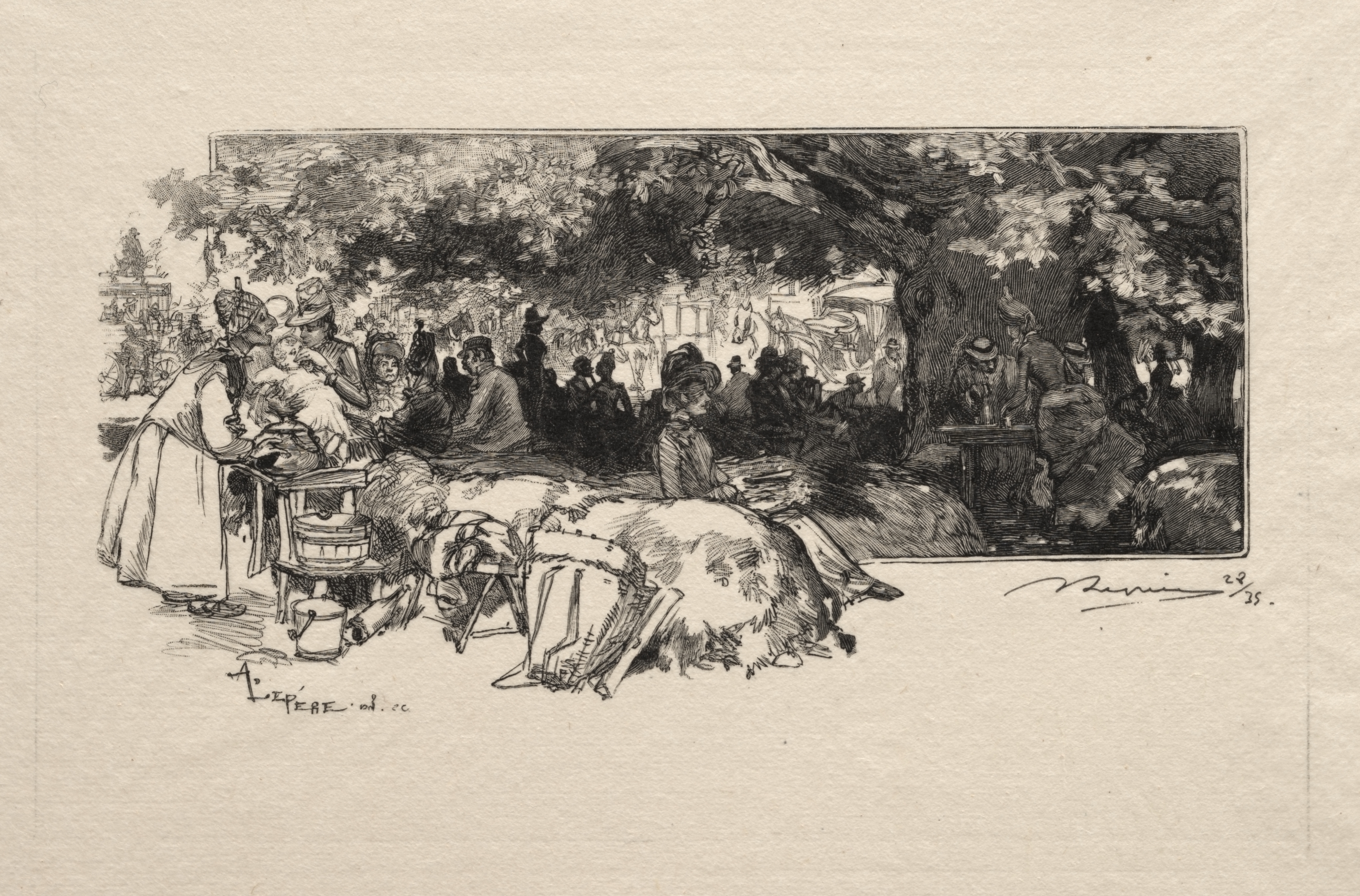 Black and white drawing on light brown paper of a woman selling or serving food to people sitting under a tree. The woman on the left wears a long dress and serves food from a cart with a large pot and other items on it. She faces right. In the foreground, a dog eats from a bowl on the ground. In the background, people sit on the ground and on chairs under a large tree. More people and buildings are visible further in the background. The artist's signature is in the bottom right corner and a second signature is near the bottom left corner.