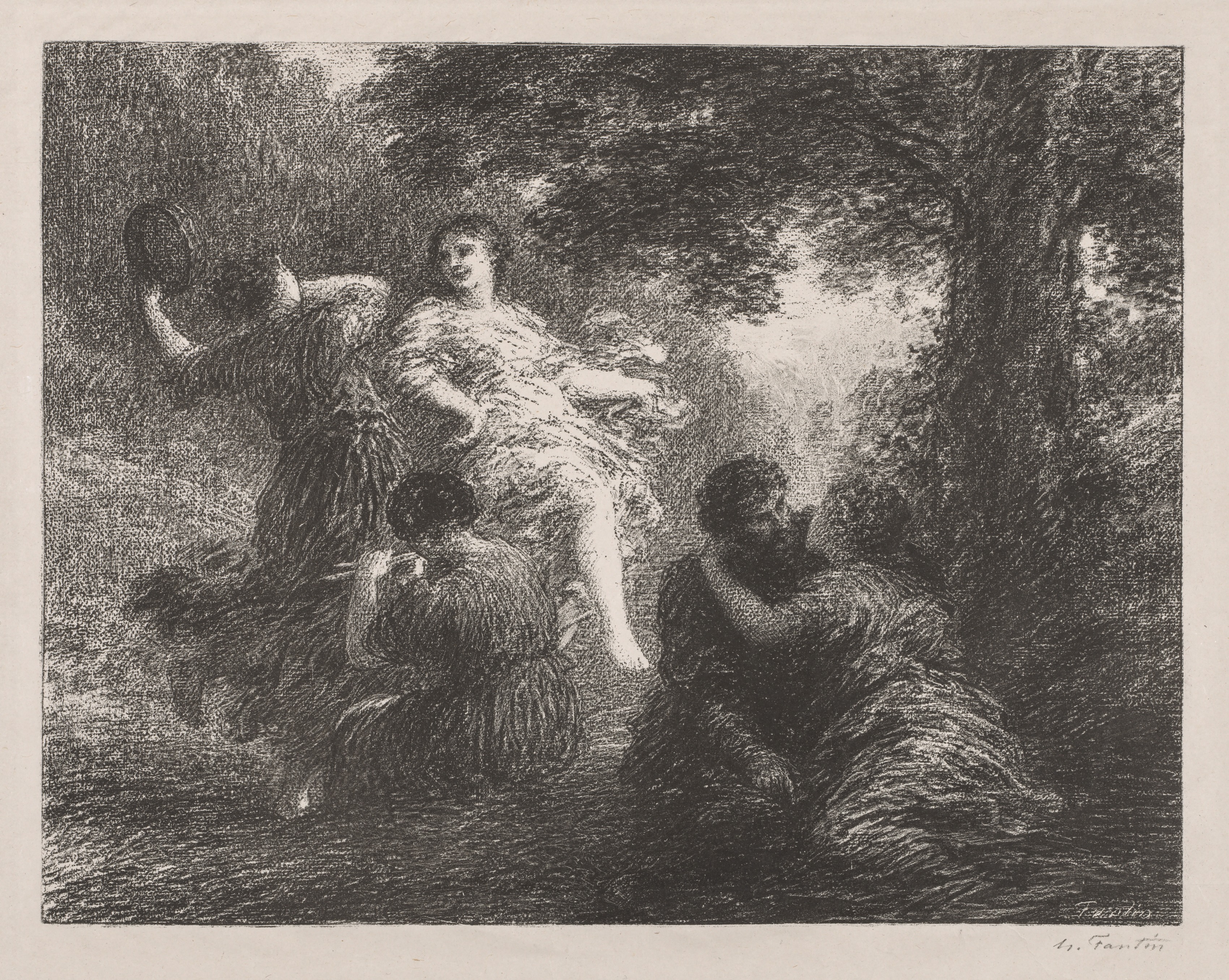 Black and white image of a titled "Pastorale" by Henri Fantin-Latour. The image depicts a woman in a flowing dress sitting on a man's lap. The woman is barefoot. She holds a tambourine in her right hand. Two women sitting on the ground are looking at her; one holds a tambourine in her right hand. The background includes trees. The image is a sketch with extreme shading and texture.